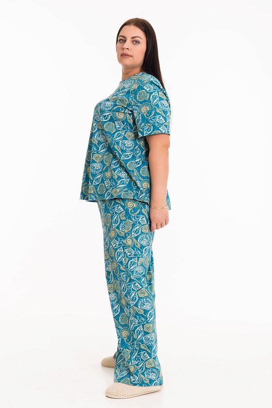 Костюм выполнен из х/б полотна с набивным рисунком. Костюм состоит из футболки с коротким рукавом и широких брюк. Горловина футболки оформлена бейкой, в рукавах манжеты. Силуэт футболки расклешенный. Брюки с карманами по бокам и поясом на резинке.