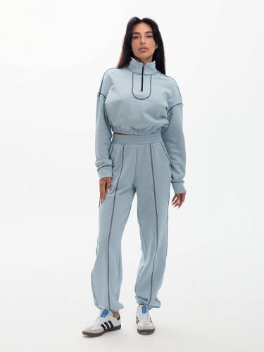 Женский костюм выполнен из футера "воздушки" в черном цвете. Толстовка с капюшоном на шнуре, спущенным рукавом и удобным карманом-кенгуру создаёт уют и комфорт. Брюки прямого силуэта, расширяющиеся к низу, выполнены с боковыми карманами и притачным поясом на резине. По центру переда проходит декоративная отстрочка, придающая образу стильный акцент. Идеальный вариант для повседневного гардероба и комфортного отдыха.