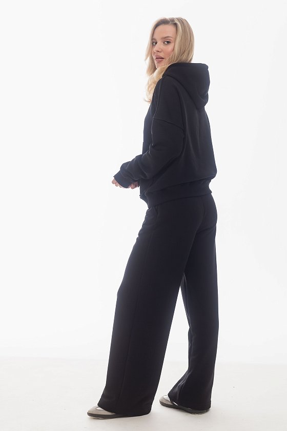 Женский костюм выполнен из футера "воздушки" в черном цвете. Толстовка с капюшоном на шнуре, спущенным рукавом и удобным карманом-кенгуру создаёт уют и комфорт. Брюки прямого силуэта, расширяющиеся к низу, выполнены с боковыми карманами и притачным поясом на резине. По центру переда проходит декоративная отстрочка, придающая образу стильный акцент. Идеальный вариант для повседневного гардероба и комфортного отдыха.