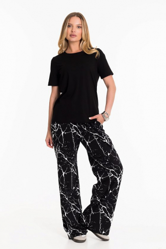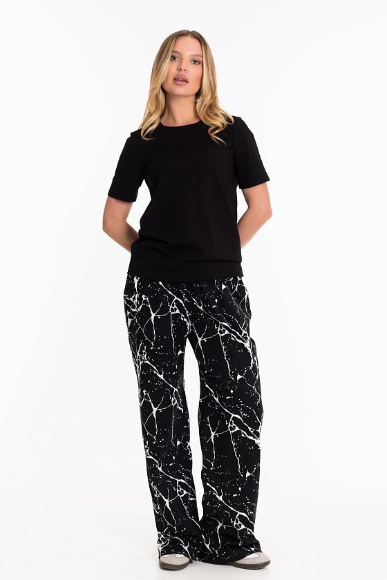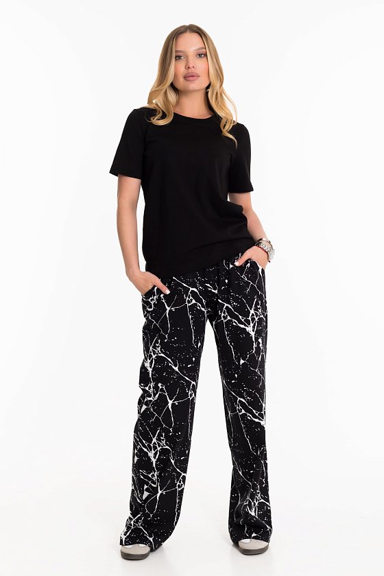 Женский костюм - футболка и брюки свободного кроя из кулирки. Футболка с короткими рукавами и круглым вырезом горловины украшена принтом сзади. Брюки свободные, пояс на широкой резинке, а по бокам есть карманы. Такой наряд подойдёт для повседневной носки, прогулок или неформальных встреч. Костюм обеспечит комфорт и свободу движений благодаря свободному крою и натуральным материалам.