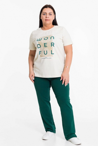 Женский костюм из хлопкового полотна — отличный выбор для повседневной носки. Костюм состоит из футболки и брюк, выполненных из мягкой и приятной к телу ткани. Футболка из кулирки с лайкрой, с втачным рукавом и принтом, что придаёт модели классический вид. Брюки из футера, прямого кроя оснащены карманами и поясом на резинке, что делает модель более функциональной и удобной. Низ брюк с декоративными разрезами, что придает изделию оригинальность. Такой костюм идеально подойдёт для прогулок, неформальных встреч или отдыха.