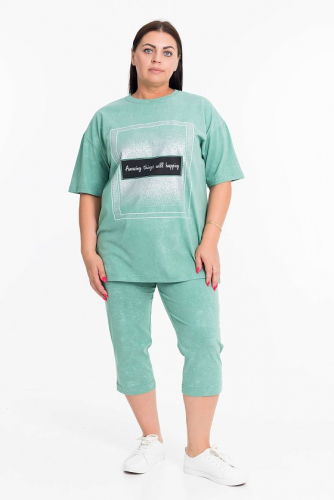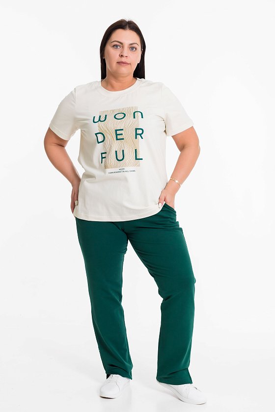 Женский костюм из хлопкового полотна — отличный выбор для повседневной носки. Костюм состоит из футболки и брюк, выполненных из мягкой и приятной к телу ткани. Футболка из кулирки с лайкрой, с втачным рукавом и принтом, что придаёт модели классический вид. Брюки из футера, прямого кроя оснащены карманами и поясом на резинке, что делает модель более функциональной и удобной. Низ брюк с декоративными разрезами, что придает изделию оригинальность. Такой костюм идеально подойдёт для прогулок, неформальных встреч или отдыха.