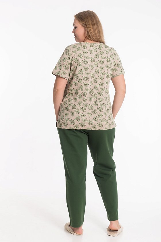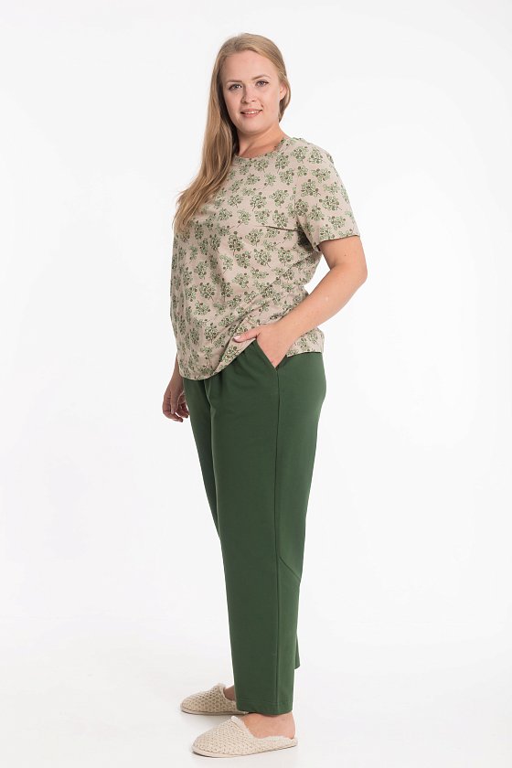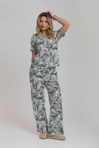 Женский костюм, сочетающий комфорт и стиль, идеально подойдёт для дома и отдыха. Брюки выполнены из однотонного футера двухнитки, имеют притачной пояс на резинке и удобные боковые карманы. Футболка изготовлена из кулирки фламли с набивным рисунком, оснащена коротким рукавом и круглым вырезом горловины. Мягкие и приятные к телу материалы обеспечивают комфорт в носке, а современный дизайн делает костюм универсальным выбором на каждый день.