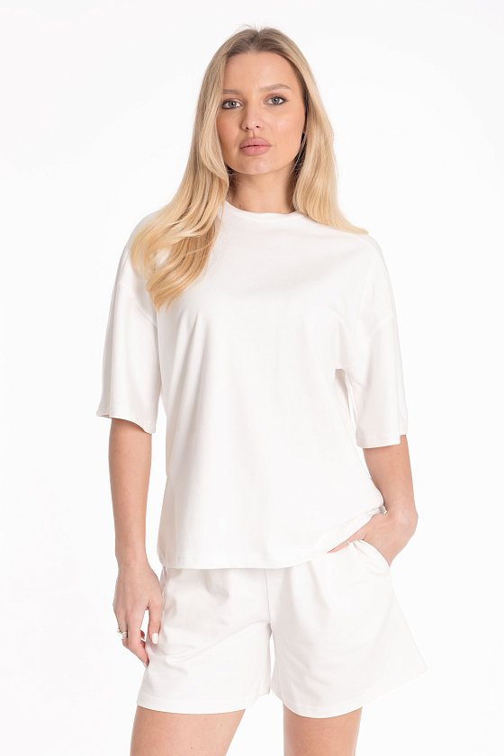 Костюм из однотонной плотной кулирки состоит из футболки и шорт. Футболка с рукавом комбинированного покроя длиной до локтя: спереди — реглан-погон, сзади — часть рукава цельнокроеная с кокеткой, часть втачная в пройму. Горловина обработана притачной планкой. Шорты с боковыми карманами и цельнокроеным поясом, дополненным шнуром, продетым через петли. Удобный и практичный комплект для повседневной носки и отдыха.