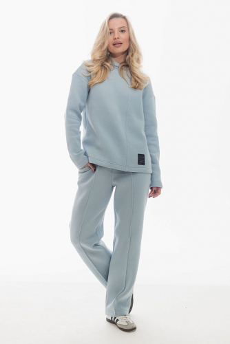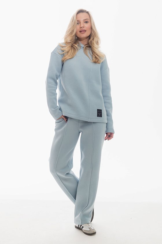 Костюм выполнен из мягкого полотна с начёсом, что делает его уютным и практичным. В комплект входит толстовка со спущенным рукавом и капюшоном, украшенная декоративной лейбой внизу. Брюки прямые, дополнены боковыми карманами и притачным поясом с резинкой внутри для удобной посадки. На передних половинках брюк выполнены аккуратные простроченные стрелки, придающие образу стильный и завершённый вид.