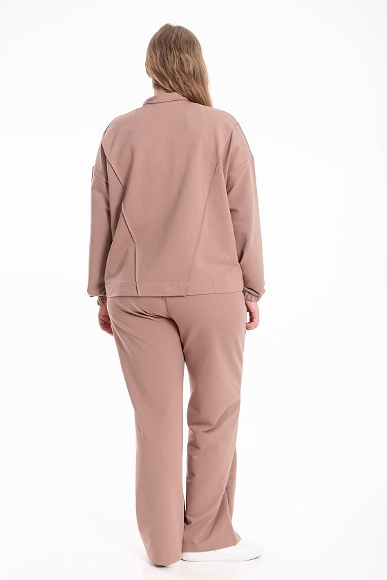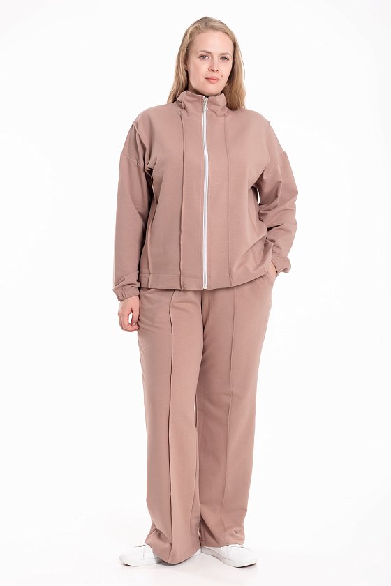 Костюм выполнен из мягкого футера и состоит из толстовки на молнии и брюк с боковыми карманами. Толстовка со спущенной линией плеча, украшена декоративными защипами на воротнике, полочках и спинке, что придаёт модели оригинальность и стиль. Брюки прямого кроя со стрелками, аккуратно простроченными для создания элегантного силуэта. Удобный и практичный костюм идеально подойдёт для повседневной носки и отдыха.