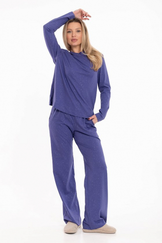 Уютный и стильный домашний костюм, состоит из лонгслива с элегантным V-образным вырезом и комфортных брюк. Мягкая кулирка с деликатным глиттером обеспечивает приятные ощущения на коже и аккуратный блеск. Брюки выполнены с притачным поясом и удобными боковыми карманами, имеют прямой свободный крой, который не стесняет движений. Идеальный выбор для домашнего отдыха и повседневных дел.