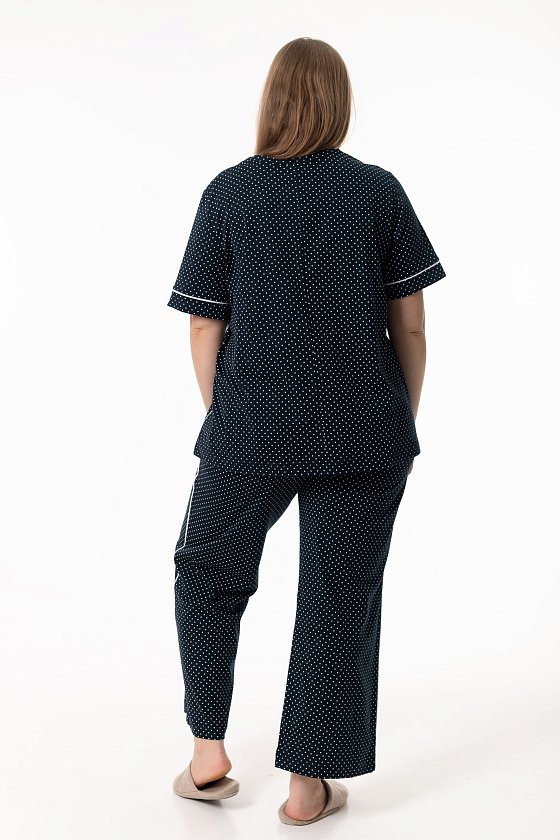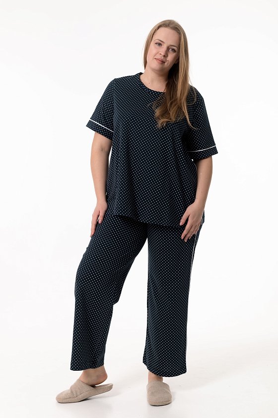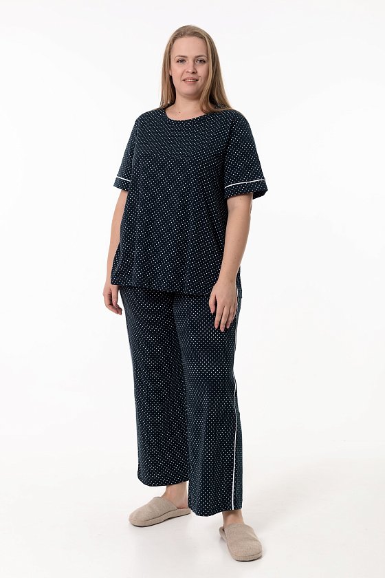 Костюм выполнен из мягкого хлопкового полотна, отлично подойдёт для комфортного отдыха и повседневной носки дома. В комплект входят футболка и широкие брюки, создающие лёгкий и свободный силуэт. Футболка имеет короткий рукав и расклёшенный крой, благодаря чему красиво сидит по фигуре и не сковывает движений. Круглый вырез горловины аккуратно обработан бейкой в тон основного полотна. Манжеты рукавов и боковые швы украшены контрастным кантом, который добавляет модели выразительный акцент. Брюки выполнены в широком крое, оснащены боковыми карманами и оформлены контрастным кантом по боковым швам, перекликающимся с отделкой футболки. Пояс на резинке обеспечивает удобную и комфортную посадку. Костюм станет отличным выбором для тех, кто ценит натуральные ткани, свободу движений и стильные детали в домашней одежде.
