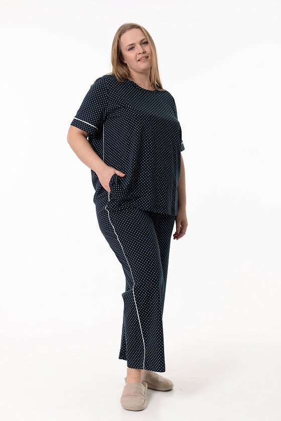 Костюм выполнен из мягкого хлопкового полотна, отлично подойдёт для комфортного отдыха и повседневной носки дома. В комплект входят футболка и широкие брюки, создающие лёгкий и свободный силуэт. Футболка имеет короткий рукав и расклёшенный крой, благодаря чему красиво сидит по фигуре и не сковывает движений. Круглый вырез горловины аккуратно обработан бейкой в тон основного полотна. Манжеты рукавов и боковые швы украшены контрастным кантом, который добавляет модели выразительный акцент. Брюки выполнены в широком крое, оснащены боковыми карманами и оформлены контрастным кантом по боковым швам, перекликающимся с отделкой футболки. Пояс на резинке обеспечивает удобную и комфортную посадку. Костюм станет отличным выбором для тех, кто ценит натуральные ткани, свободу движений и стильные детали в домашней одежде.