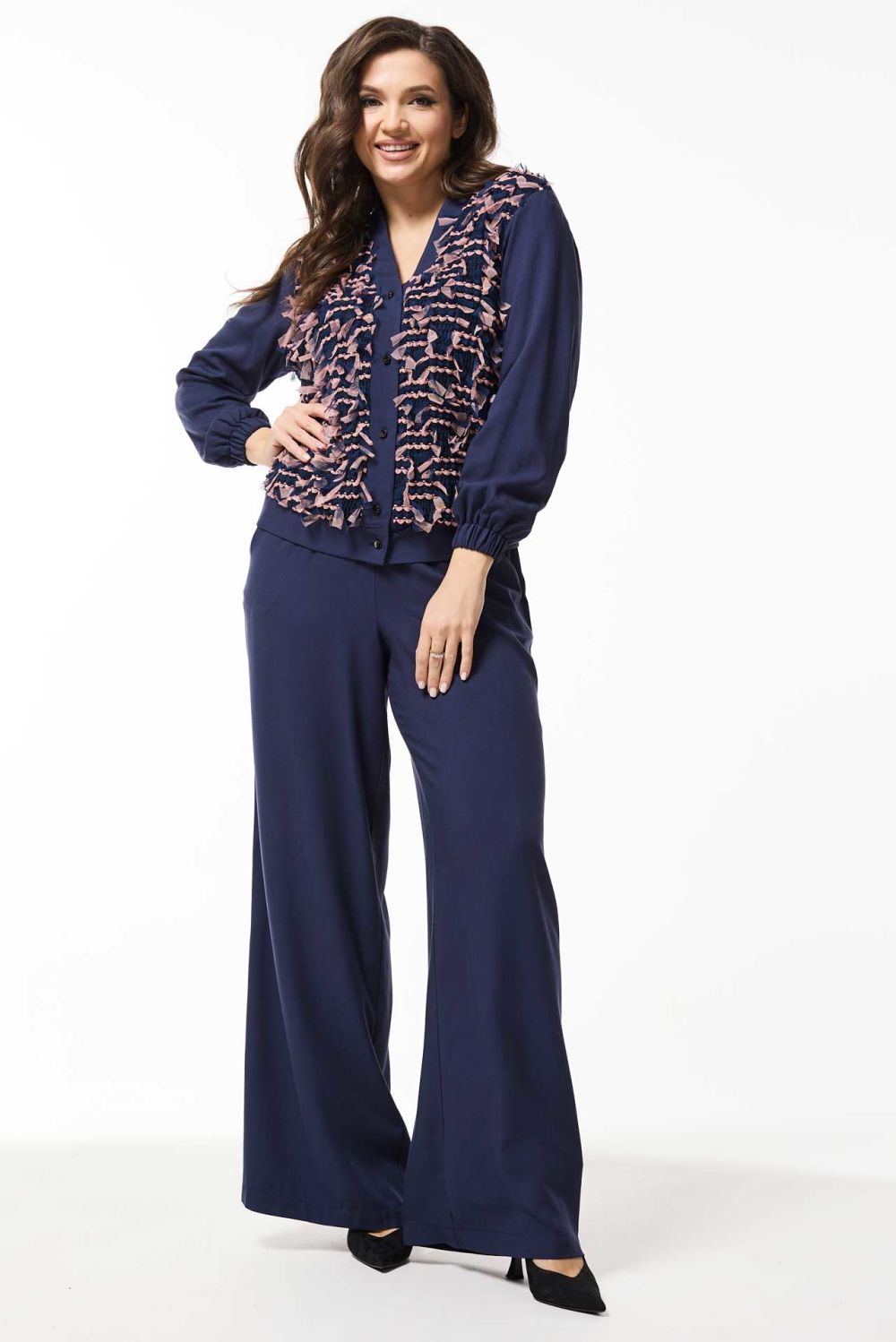 Комплект женский, из разных по фактуре тканей, состоящий из жакета на трикотажной подкладке и брюк палаццо. Жакет с притачной планкой по борту, с центральной застежкой на петли-пуговицы. Плечо спущенное, рукав втачной, с манжетой. Полочки и рукава из отделочной ткани. Брюки палаццо, на притачном поясе с резинкой и тесьмой. У брюк - боковые карманы.