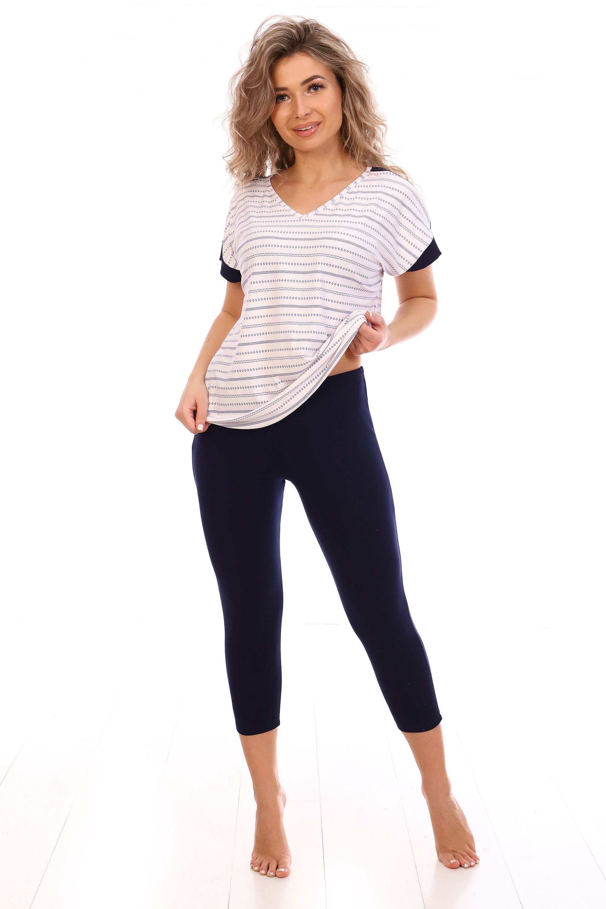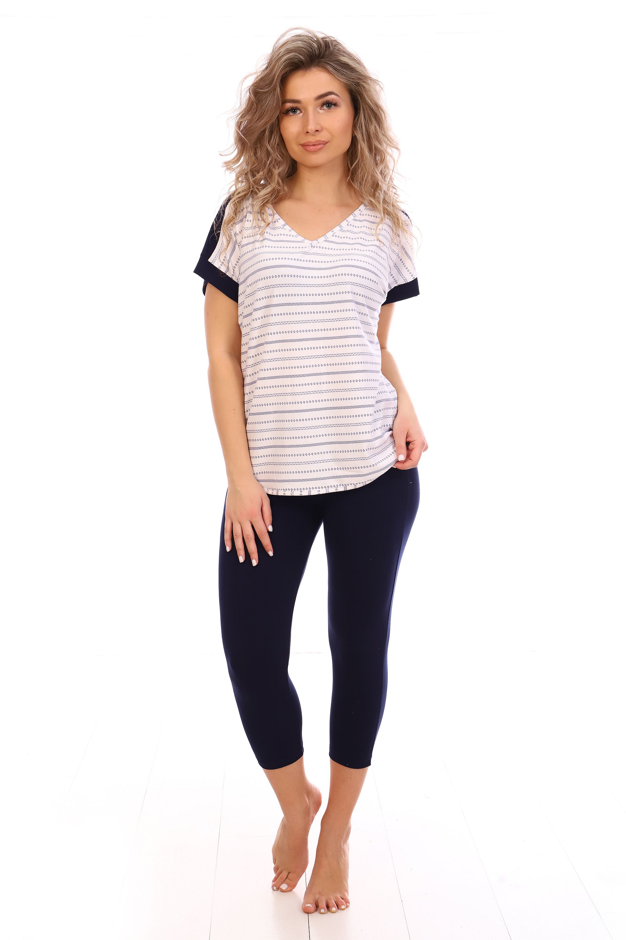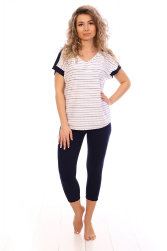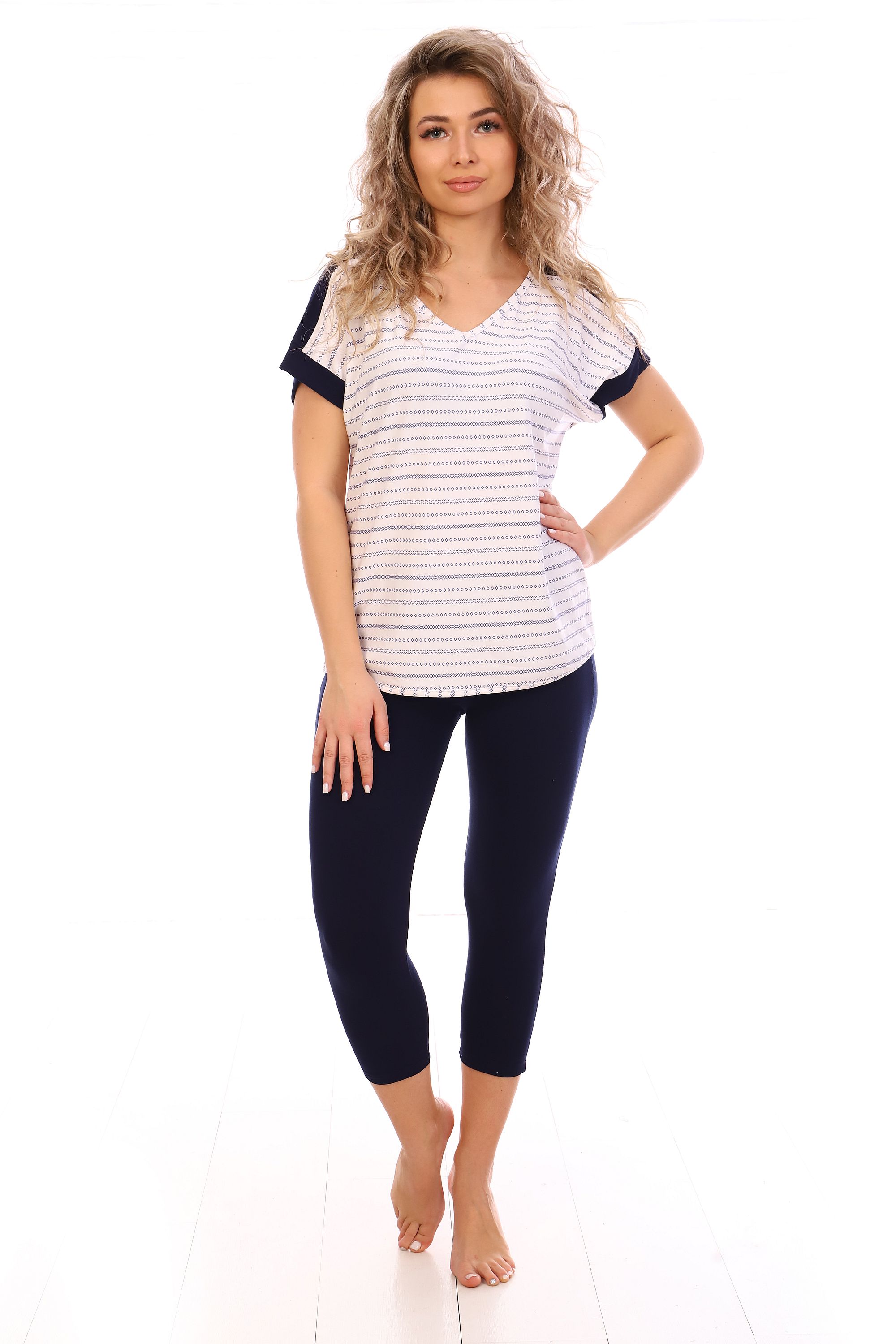 Женский трикотажный костюм из вискозы. Костюм состоит из однотонных бридж свободного силуэта и блузы. Бриджи длиной до середины икры на манжете, в боковых швах карман с отрезным бочком и настрочной мешковиной. Блуза с цельнокроеным коротким рукавом. Нижний срез блузы фигурный, мягко-закруглённый по боковому шву. По плечевому шву и нижнему срезу рукава отделочные планки из однотонной вискозы. Вырез горловины V-образный. Вход в карман, горловина и нижний срез блузы окантованы однотонной вискозой. Струящийся, приятный к телу материал в сочетании с нежной расцветкой создают лёгкий летний образ. Костюм идеально подойдёт как для отдыха, так и для повседневного гардероба. Натуральный, дышащий материал. Оптимальное соотношение цены и качества.