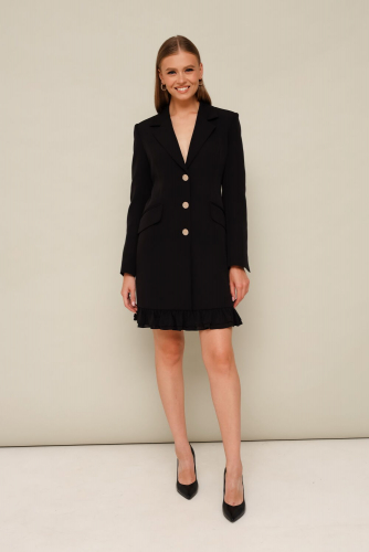 Жакет полуприлегающего силуэта, выполнен из костюмной ткани (чуть тянется) с модным принтом «Леопард», на подкладке. По переду талиевые вытачки, отрезной бочок, функциональные прорезные карманы с клапаном, центральная двубортная застежка на петли-пуговицы. Горловина оформлена глубоким V-образным вырезом и широким воротником пиджачного типа. Спинка со средним швом. Рукава втачные, двухшовные со шлицами и отделочными пуговицами. Маленьким акцентом ультрамодного жакета являются стильные металлические пуговицы.