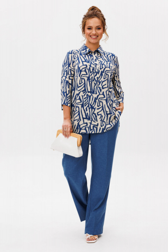 Брюки прямого, свободного кроя с высокой посадкой из костюмной ткани (тянется). В боковых швах наклонные карманы. По срезу банта – застежка-молния. Верхний срез брюк оформлен поясом с эластичной резинкой по задней половинке.