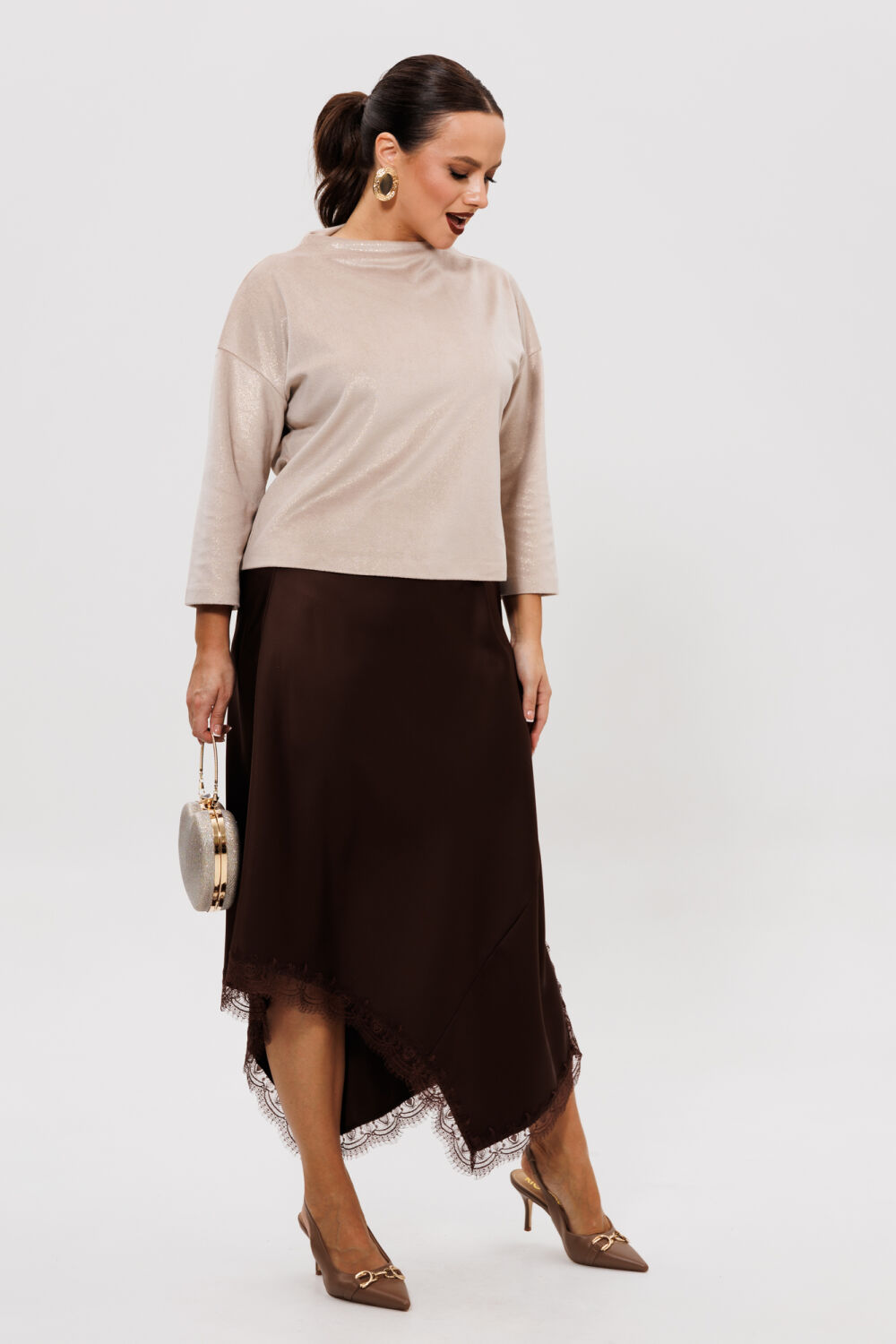 Юбка расширенная к низу из струящегося шелка «Армани» (тянется), ассиметричная по линии низа с отрезным клином. Низ юбки декорирован французским кружевом. Верхний срез оформлен поясом с эластичной резинкой.