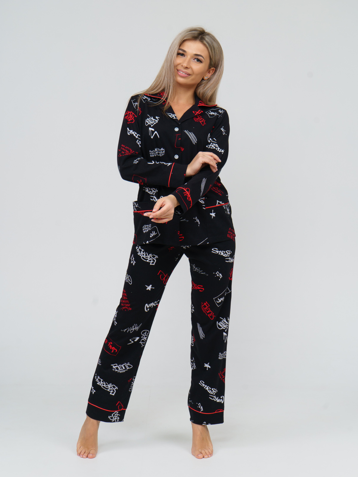 Женская хлопковая пижама в костюмном стиле бренда НСД-стиль. Комплект выполнен из 100% хлопка. Рубашка на пуговицах, воротник шалевого типа, на рубашке два накладных кармана, кант на манжетах, застежка пуговицы. Брюки прямого кроя, пояс - широкая резинка, кант внизу. Удобная модель на каждый день и для особых поводов, подойдет для отдыха, для дома, сна, в роддом, кормящим мамам и на выписку. Женская пижама из хлопка станет отличным подарком на праздники, подруге, маме, бабушке, сестре, жене. Ее можно носить как домашний костюмчик.