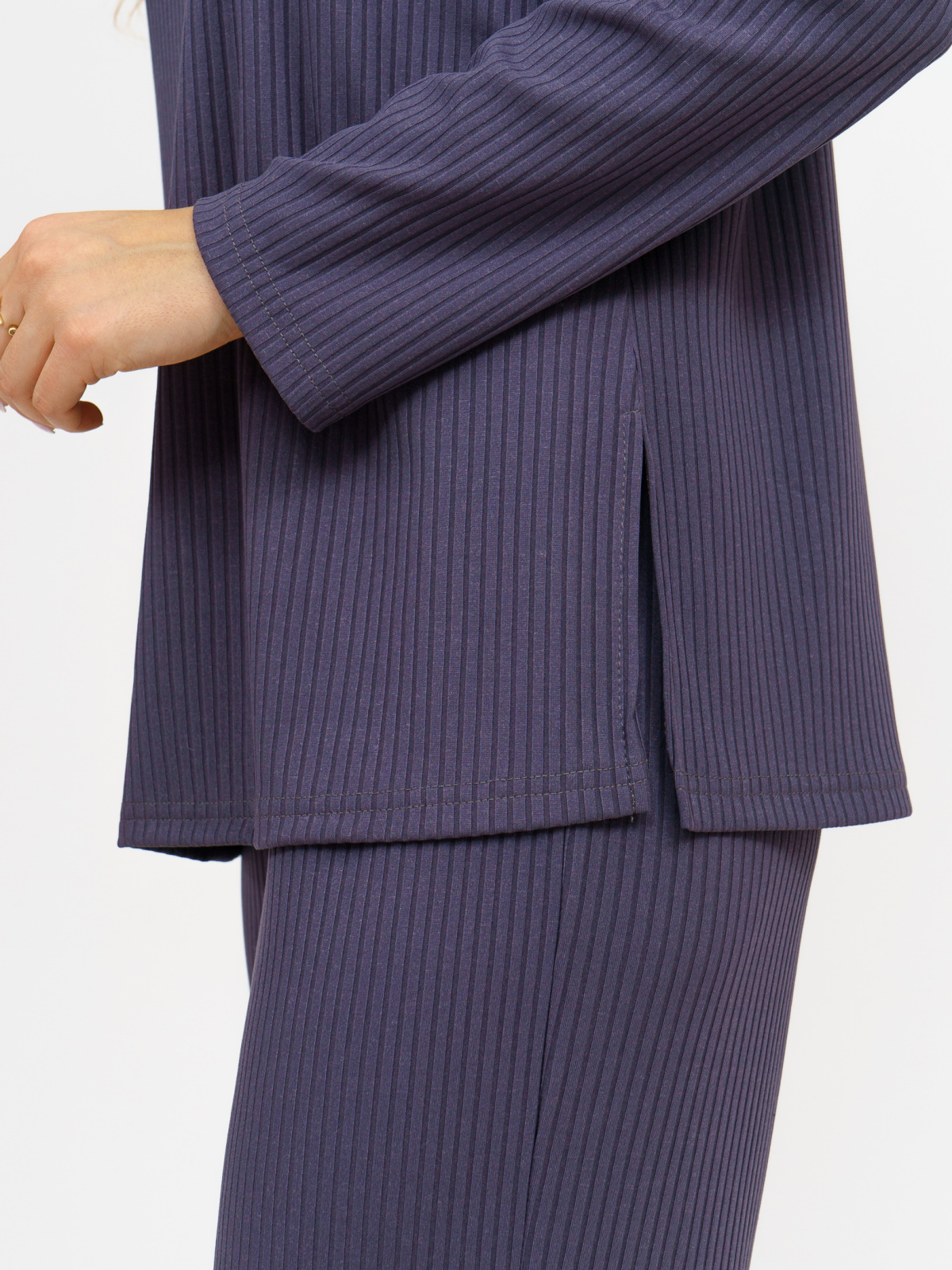 Ткань комплекта - это тонкий, мягкий, легкий трикотажный материал с вискозой, не закатывается, не линяет. Комплект состоит из двух частей - прямые свободных брюк в стиле кэжуал и удлиненного лонгслива с разрезами кроя оверсайз.
