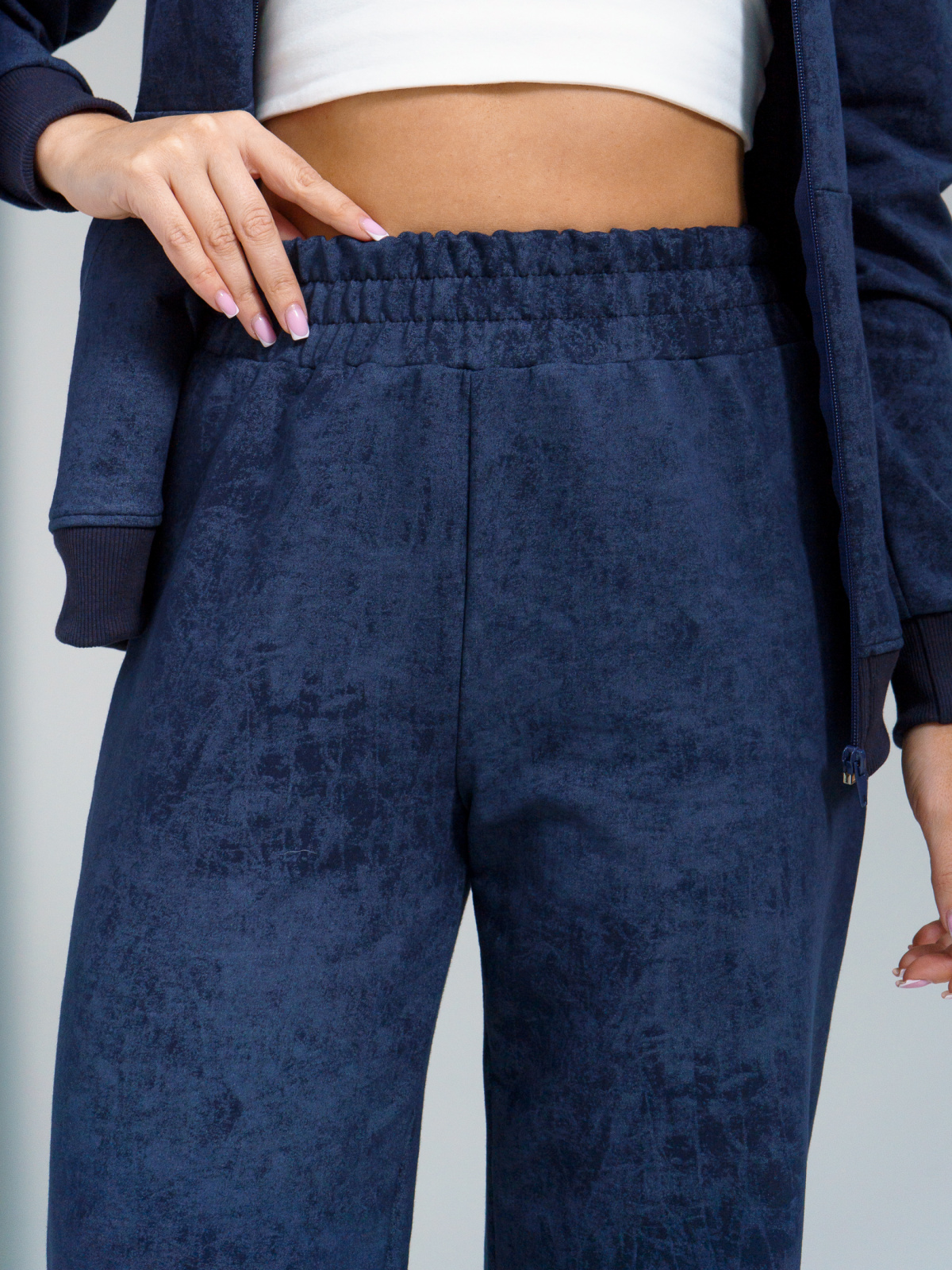 В наборе толстовка с длинным рукавом и брюки. Толстовка имеет удобную застежку на молнию и два удобных кармана. Широкие брюки, не стесняют движений, переливающийся материал с имитацией варёнки – главный составляющий стильного костюма на этот сезон.