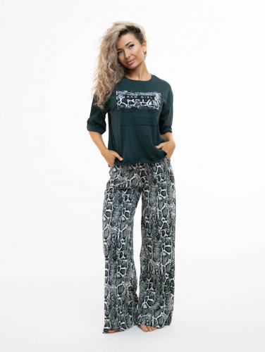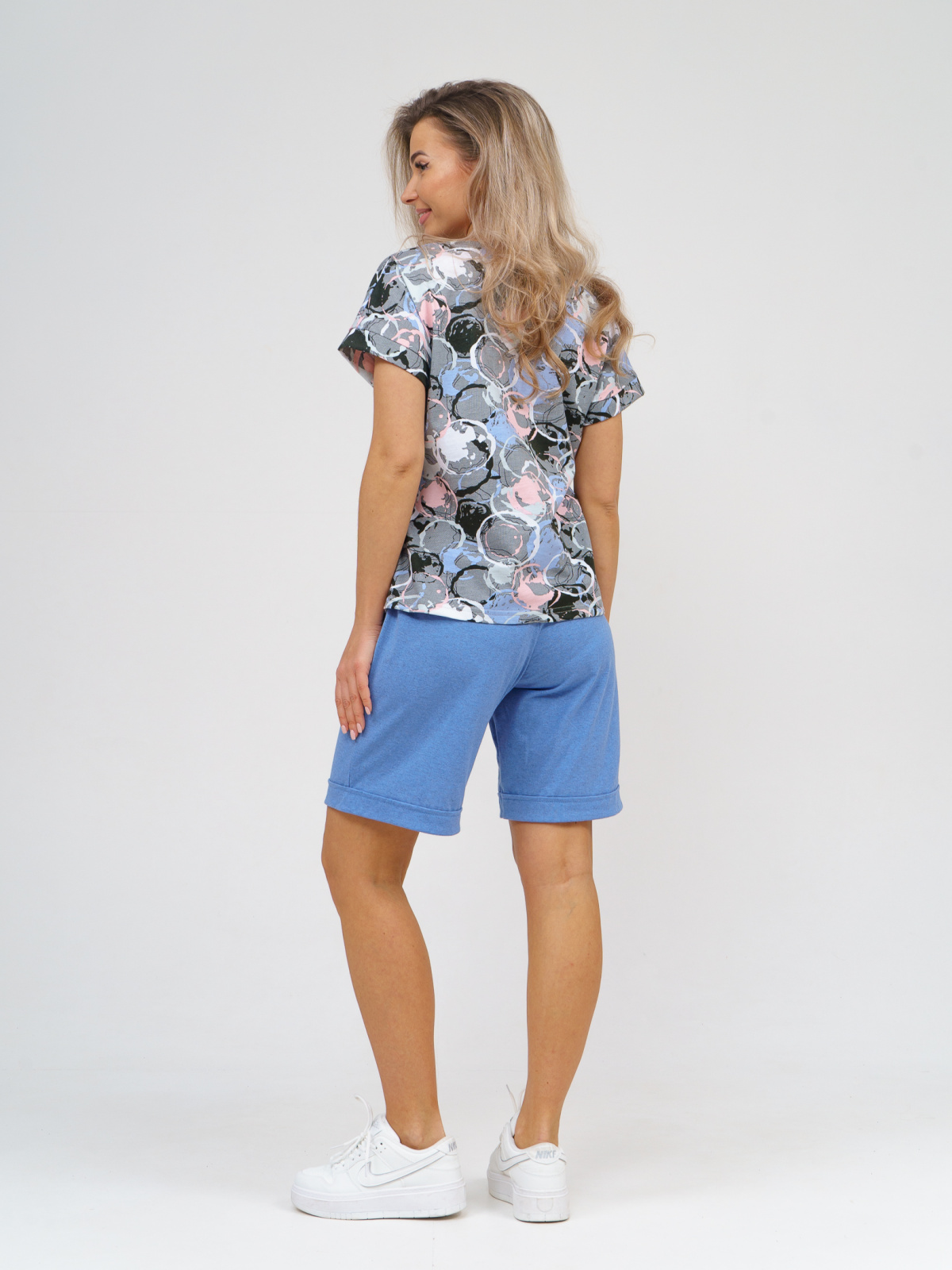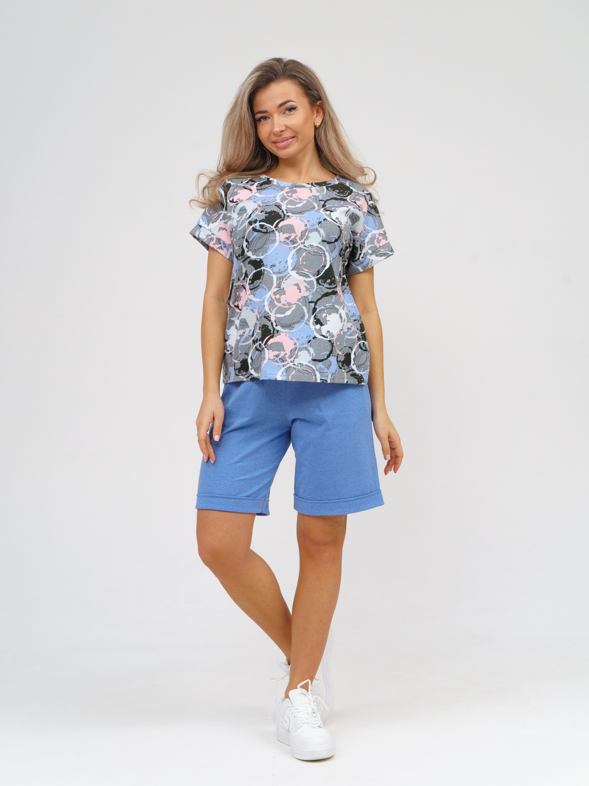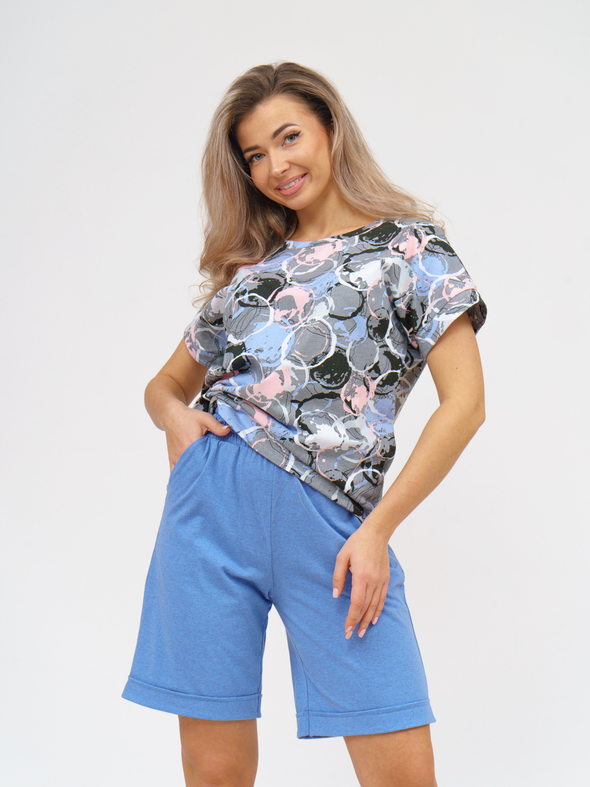 Удобный, практичный не стесняющий движения комплект, состоящий из футболки свободного кроя со спущенным рукавом и шорт с фиксированными отворотами. Шорты имеют удобную резинку и два удобных потайных кармана. Костюм выполнен из качественных натуральных тканей, а набивной рисунок на футболке придает нежности и яркости этой модели.