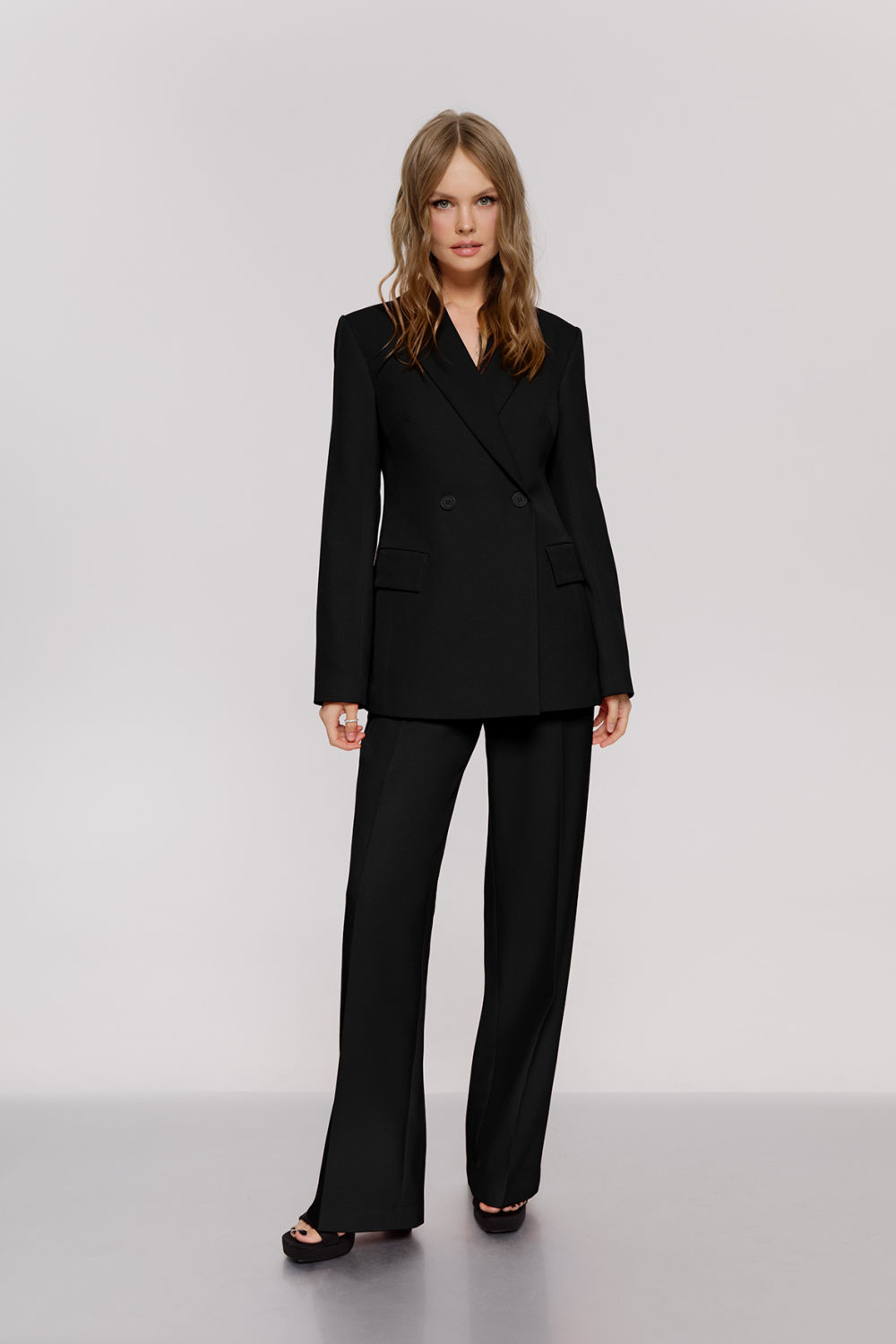 Текстильный костюм-двойка из двубортного полуприлегающего жакета и прямых брюк со стрелками. Детали: жакет с отрезными бочками и нагрудными вытачками, пиджачный воротник, прорезные карманы, застежка на петли и пуговицы, спинка со средним швом, втачные двухшовные рукава, жакет на подкладке. Брюки с высокой посадкой на притачном поясе со шлевками, передние половины с небольшими застроченными мягкими складками и заутюженными стрелками, застежка на молнию и пуговицу, боковые карманы