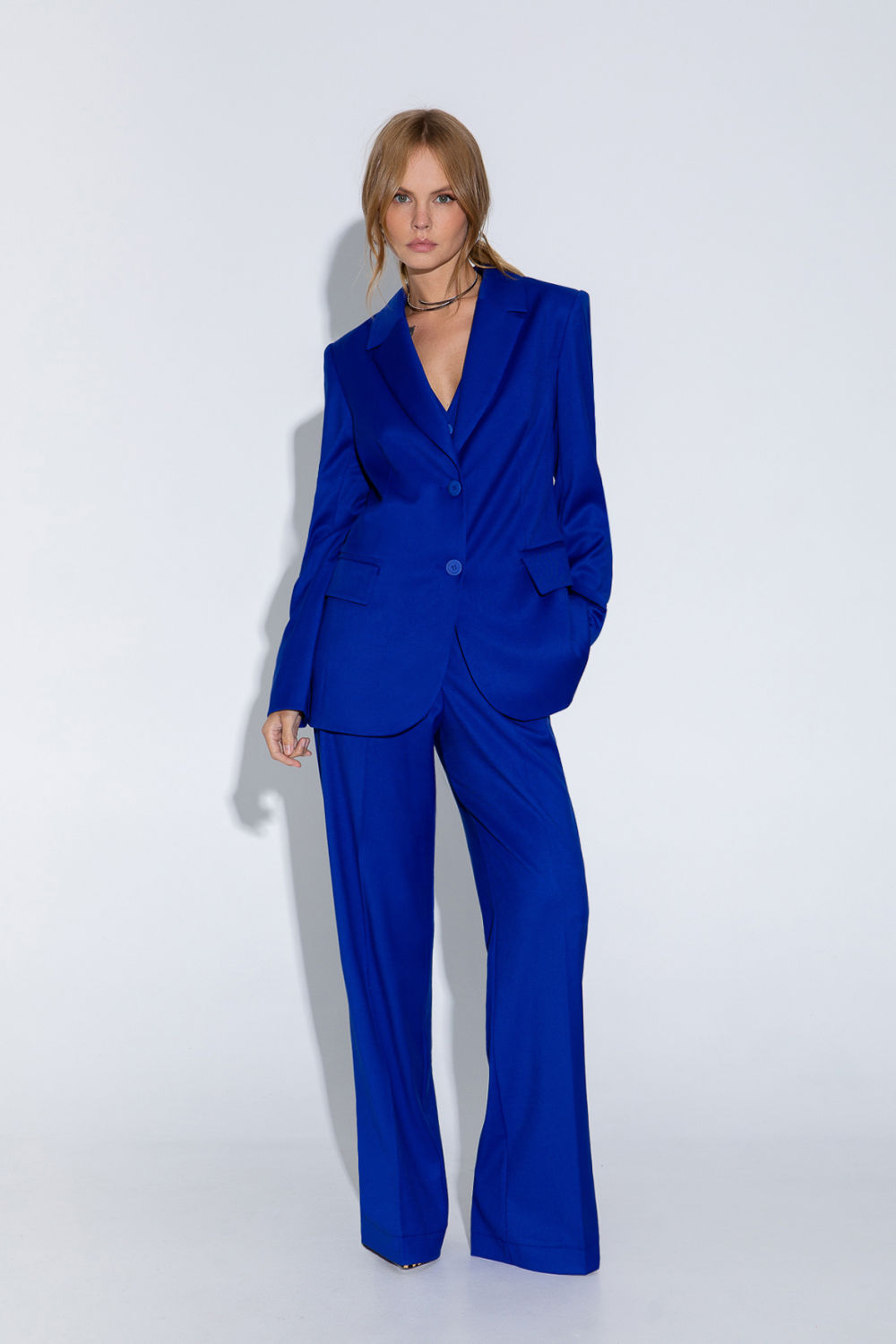 Текстильный костюм-тройка из свободного жакета со шлицами, жилета и прямых брюк-палаццо