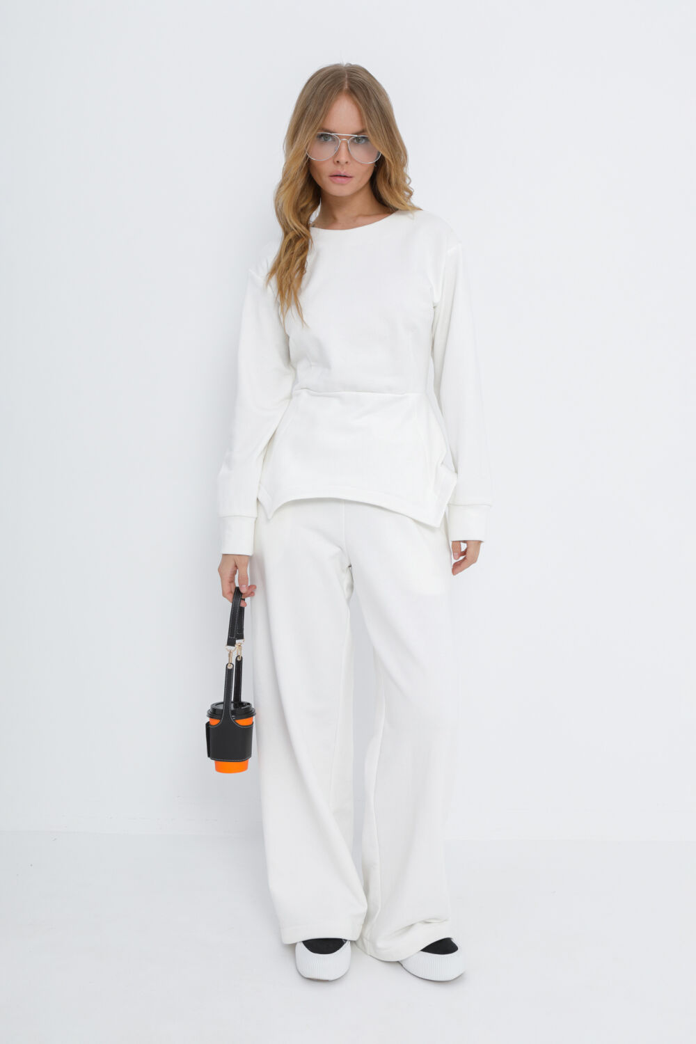 Трикотажный костюм-двойка из приталенного джемпера и свободных брюк.