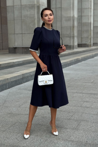 Детали: туника приталенного силуэта, широкая горловина переда и спинки, талиевые вытачки, фигурный низ, потайная застежка-молния в среднем шве спинки. Брюки с высокой посадкой, передние половины брюк с двумя складками, эластичный пояс-резинка, боковые карманы, без застежки.