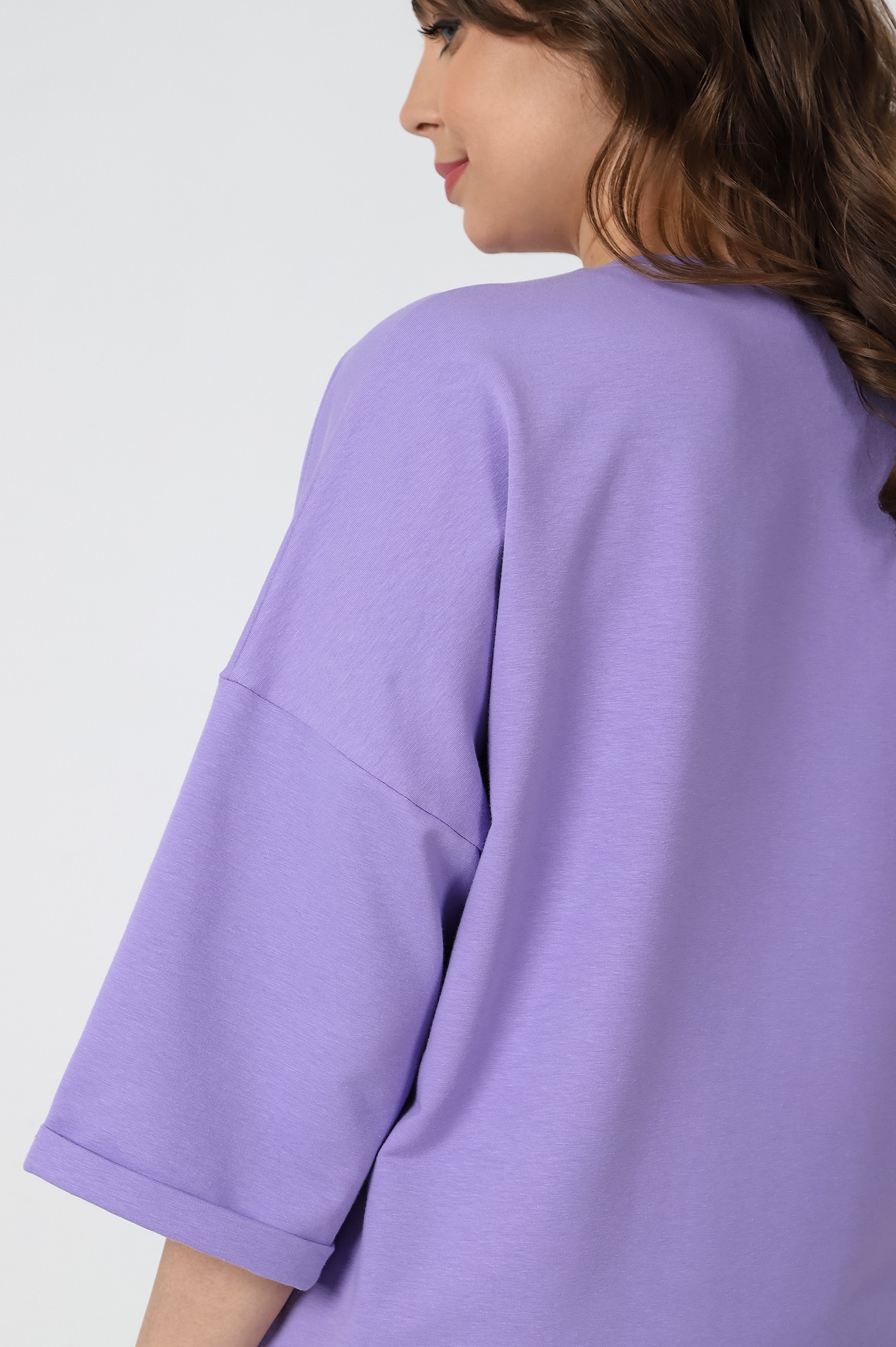 Джемпер – свободного покроя, с рукавами на основе цельнокроеных длиной до локтя, горловиной овальной формы, обработанной втачной планкой, разрезами в боковых швах и принтом на полочке. Рукава – с цельнокроеными манжетами-отворотами. Модный элемент- разность длины полочки и спинки на 10 см.