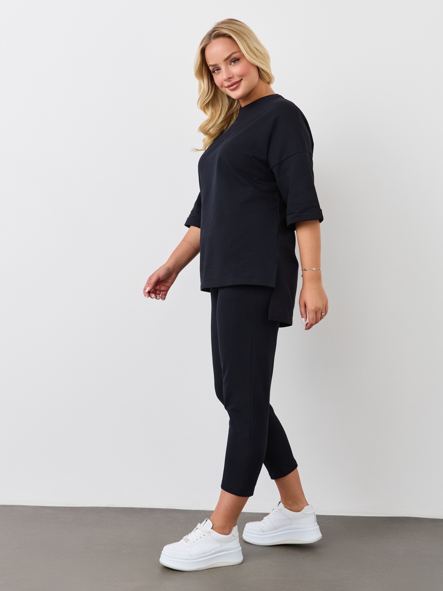 Костюм из гладкокрашеного трикотажного полотна «футер-двунитка», состоящий из джемпера и брюк.