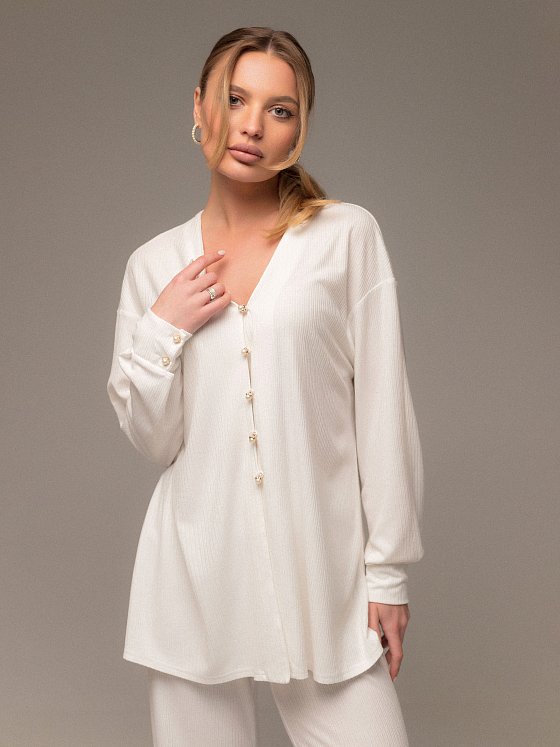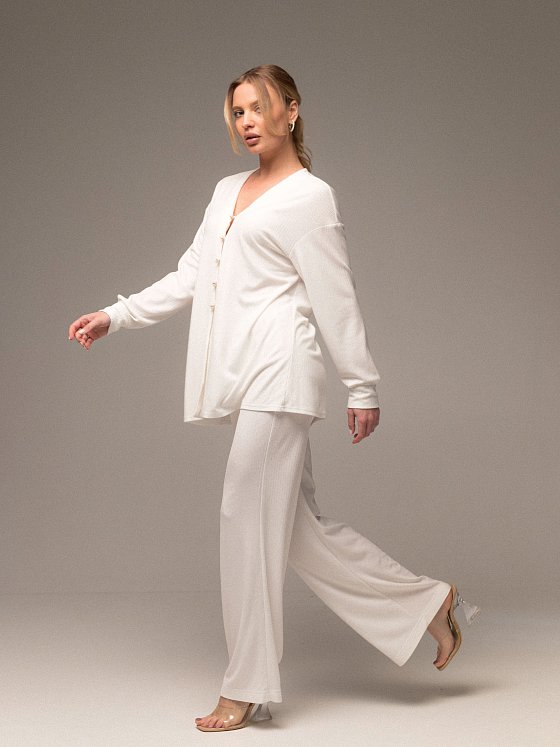 Женский костюм из интерлока ринг-вискона с деликатной фактурой — сочетание комфорта и утончённого стиля. Комплект состоит из свободной рубашки на изящных пуговицах и брюк с комфортной посадкой. Рубашка выполнена со спущенной линией плеча, манжетами по низу рукавов и аккуратной линией застёжки, подчёркивающей лёгкий силуэт. Интерлок ринг-вискон приятен к телу, красиво драпируется и сохраняет форму, делая костюм идеальным для повседневных образов и расслабленного отдыха.
