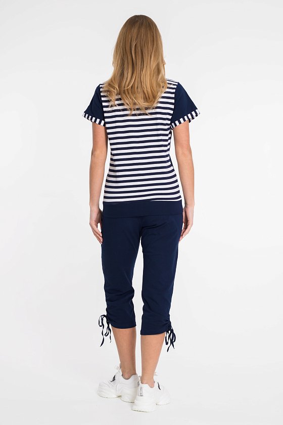 Женский костюм выполнен из хлопкового полотна. Удлинённая футболка с высоким воротником спереди застёгивается на молнию. Украшена вставками из полотна в полоску и боковыми карманами. Капри прямого покроя с накладными карманами, по бокам стягиваются при помощи шнурков.