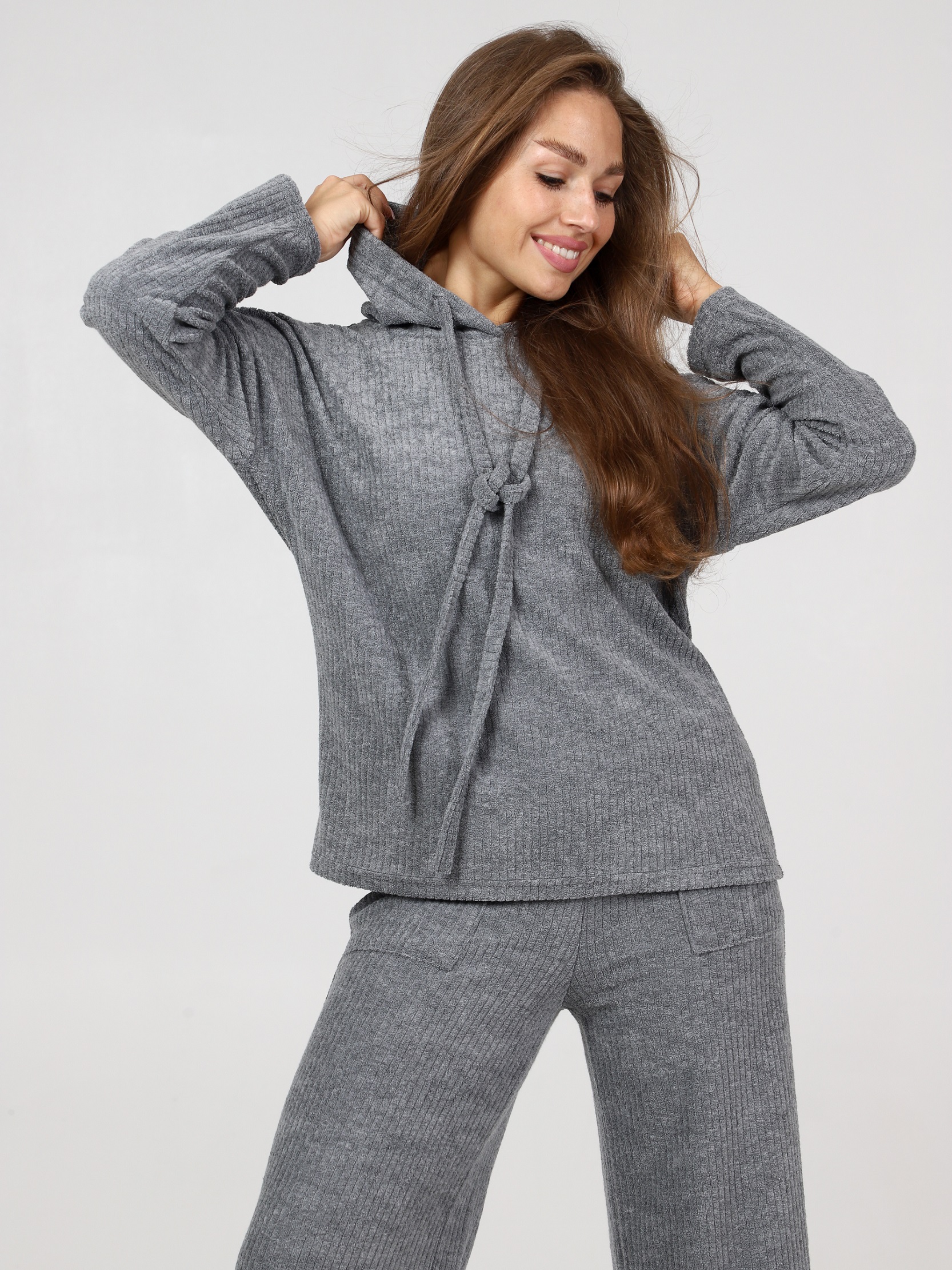 Махровый костюм в рубчик - это великолепное сочетание уюта, тепла и стиля, которое идеально подходит для дома. Костюм состоит из худи свободного кроя с длинным рукавом со спущенным плечом и брюк прямого кроя с карманами.