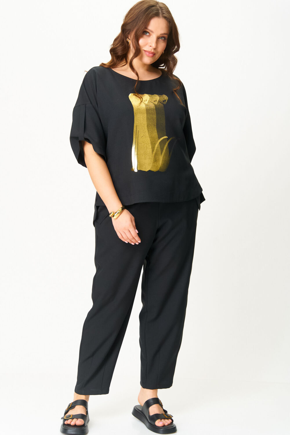На блузоне выполнена печать фольгой. Брюки  с функциональными карманами, пояс на резинке.