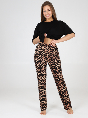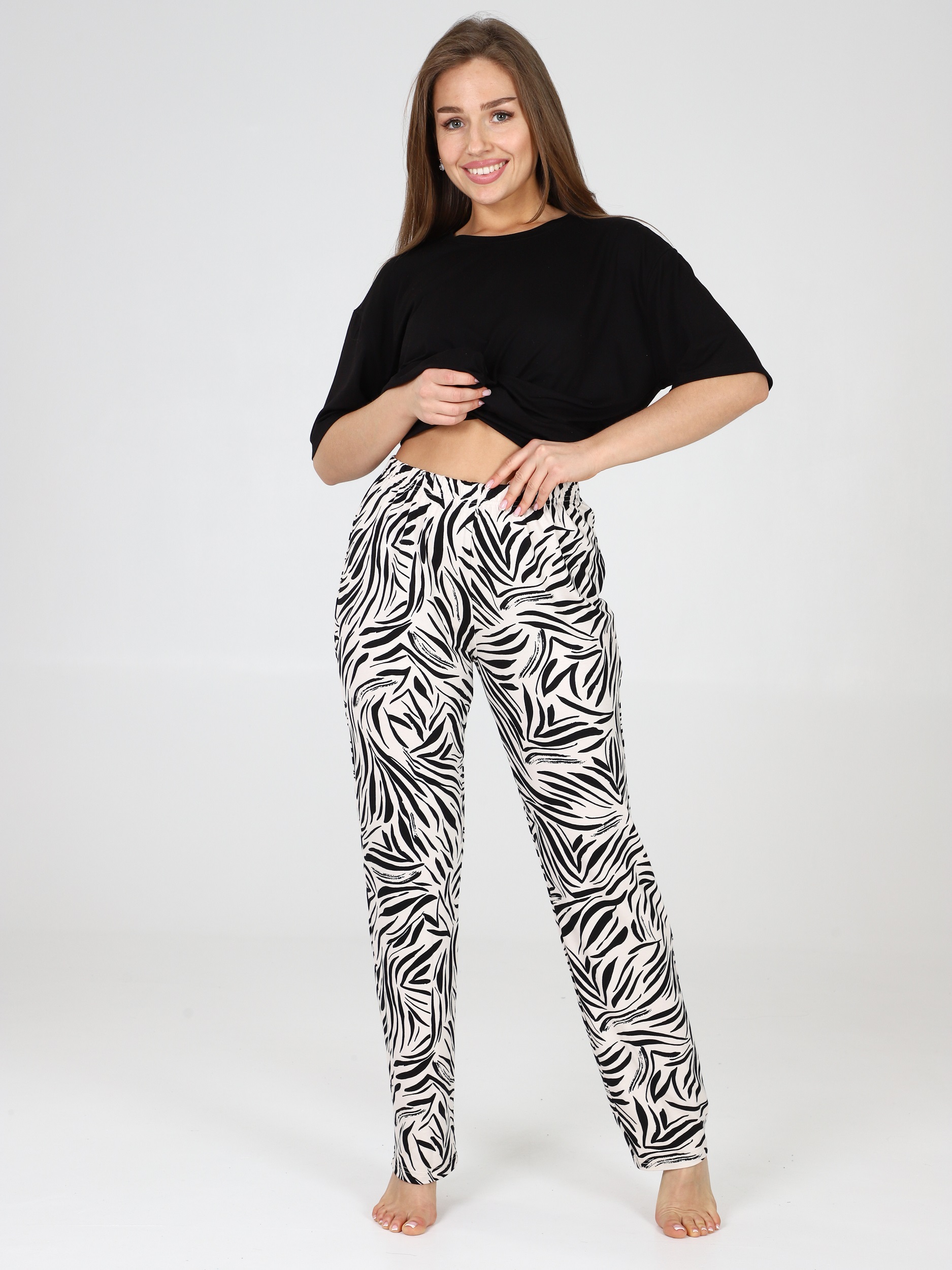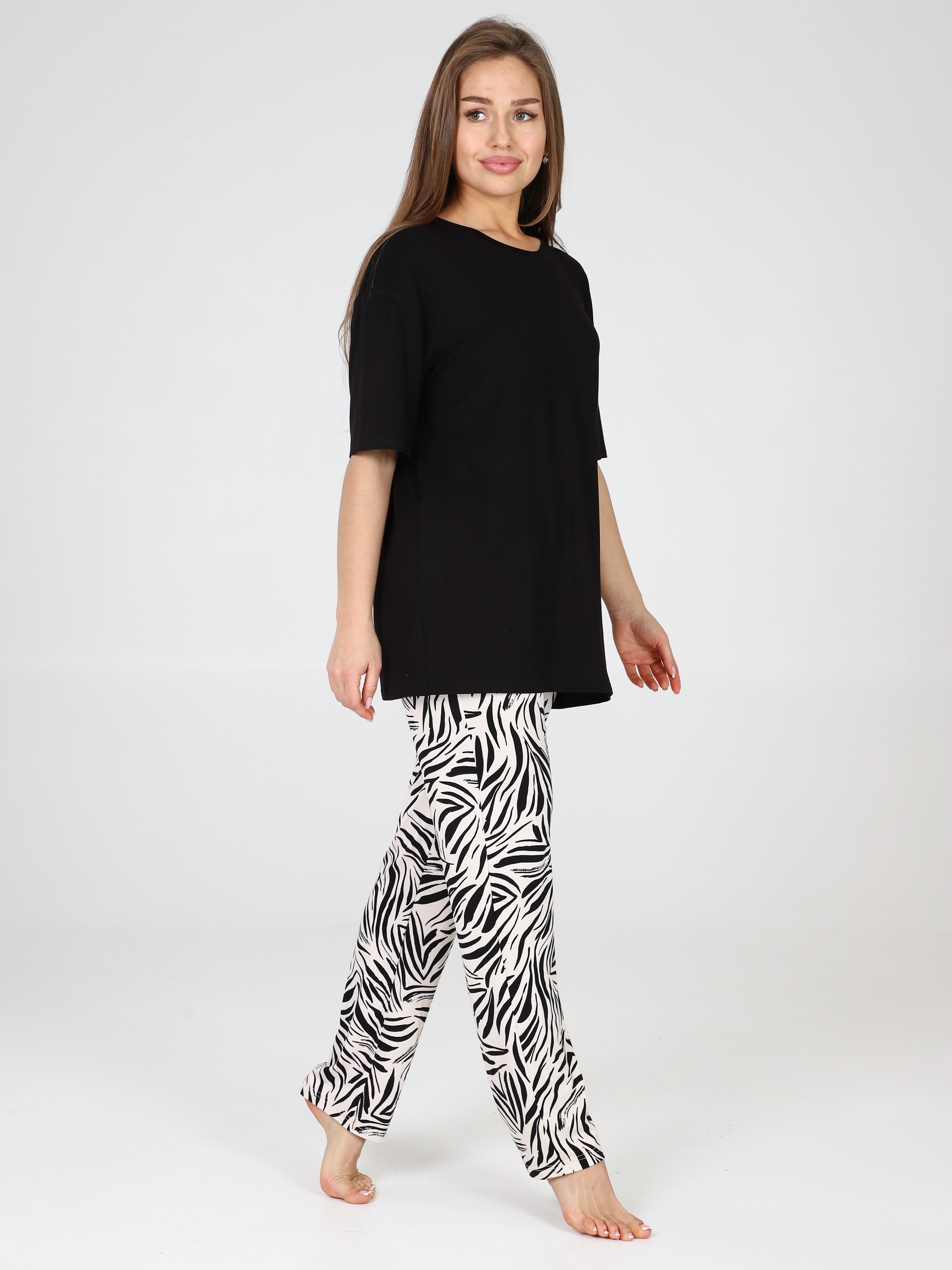 Костюм для женщин состоит из удлиненной футболки в стиле oversize и брюк. Модная свободной формы футболка со спущенным рукавом и прямые брюки с посадкой по талии будут незаменимыми вещами в путешествии , а также заменят пижаму и домашнюю одежду на даче.