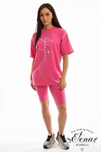 Спортивный костюм из однотонной футер петли с лайкрой. Состоит из брюк и толстовки. Толстовка свободного покроя, с рукавом реглан, капюшоном и собрана по низу на резинку. На брюках и рукавах настрочена лампасная тесьма. В люверсы капюшона вставлена репсовая лента. Спереди на толстовке расположена декоративная нашивка. Брюки с поясом на резинке и манжетами.
