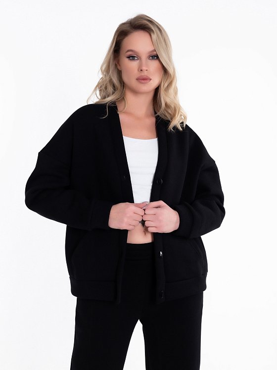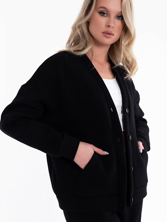 Женский костюм из футера трёхнитки — стильное и практичное решение для повседневного гардероба. В комплект входит кардиган со спущенным рукавом и застёжкой на пуговицы, дополненный накладными карманами, а также брюки на резинке с удобной посадкой. Низ брюк оформлен декоративными защипами с пуговицей. Универсальный фасон позволяет сочетать костюм для прогулок и повседневной носки, обеспечивая комфортный и современный стиль.