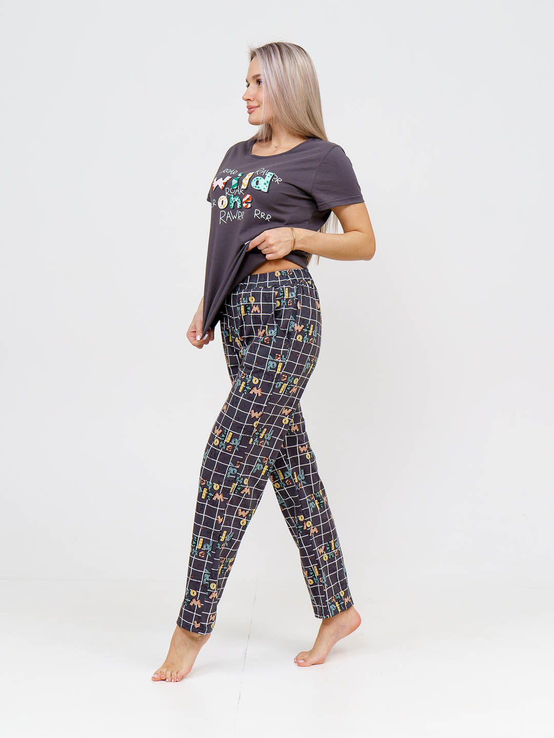 Костюм молодёжный из комбинированного трикотажного полотна. Футболка полуприлегающего силуэта длиной чуть ниже уровня бёдер. Рукав втачной базового покроя короткий. Вырез горловины 0-образный.Брюки прямого силуэта, верхний край обработан резинкой.
