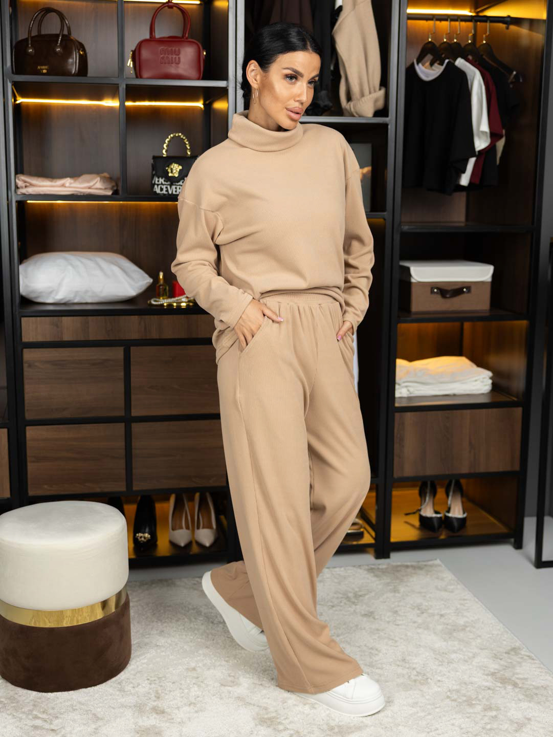 Женский костюм с брюками из лапши ангоры. Верх костюма с воротником стойкой и спущенной проймой придает образу элегантный вид и легкую небрежность. Трендовые прямые брюки с карманами в боковых швах и поясом на поясной машине, комфортны для повседневной носки. Материал приятный на ощупь, в нем будет комфортно в прохладную погоду.