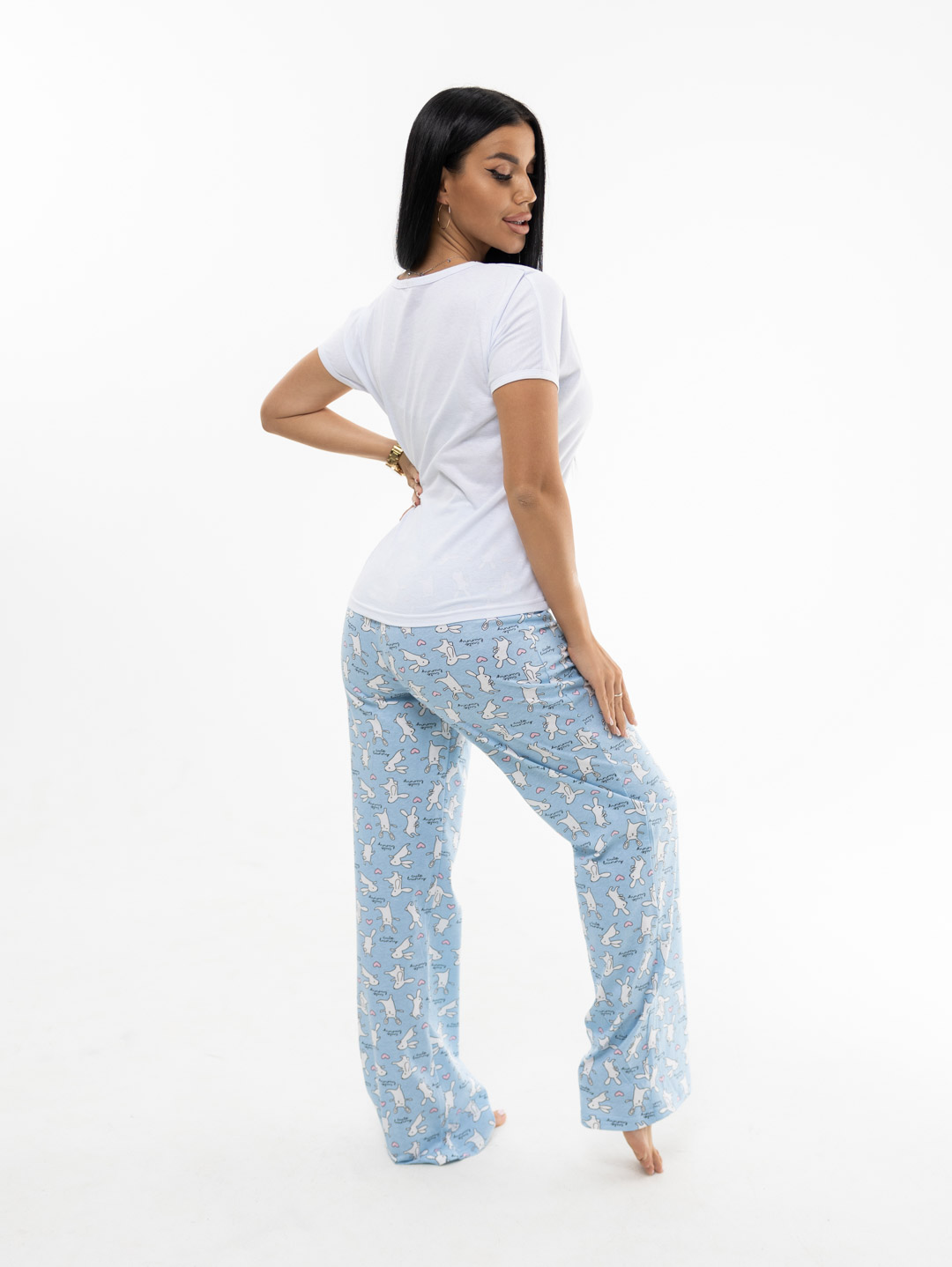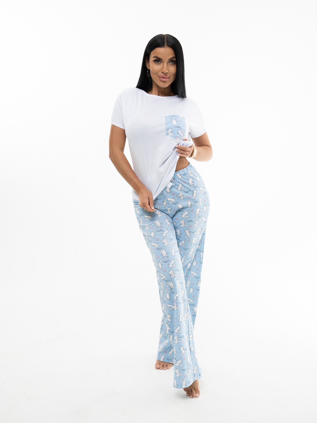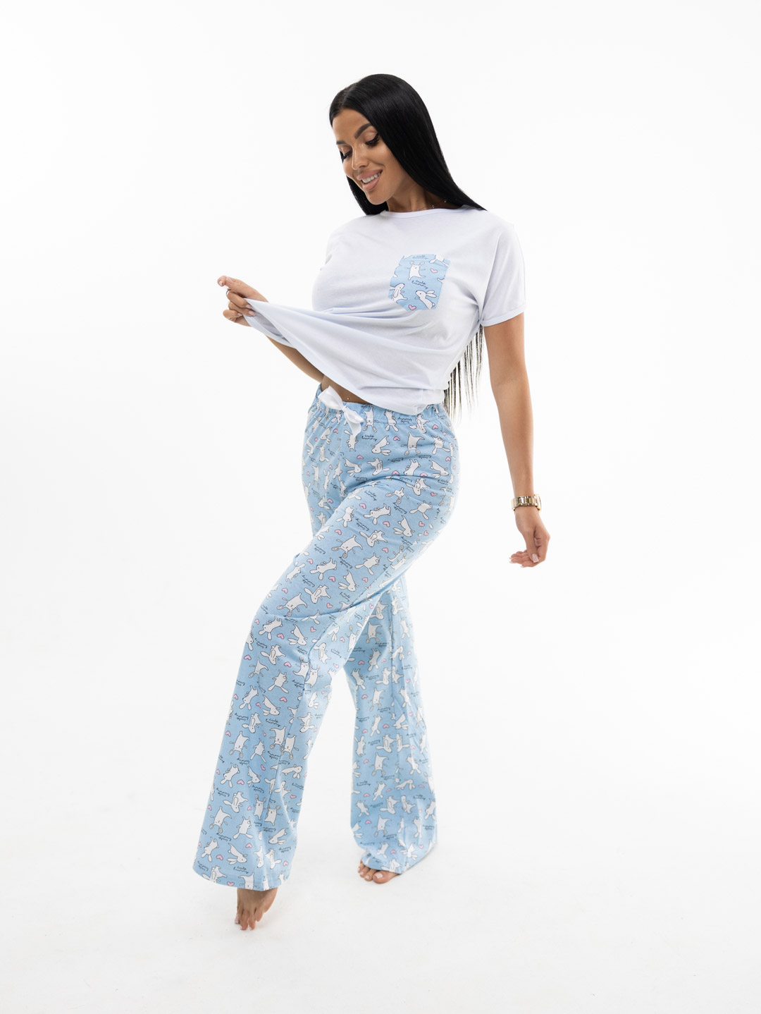 Женский костюм с брюками из 100% хлопка. Футболка со спущенной линией плеча, О-образной горловиной и накладным карманом на полочке. Широкие брюки из набивной кулирки с атласным бантом.