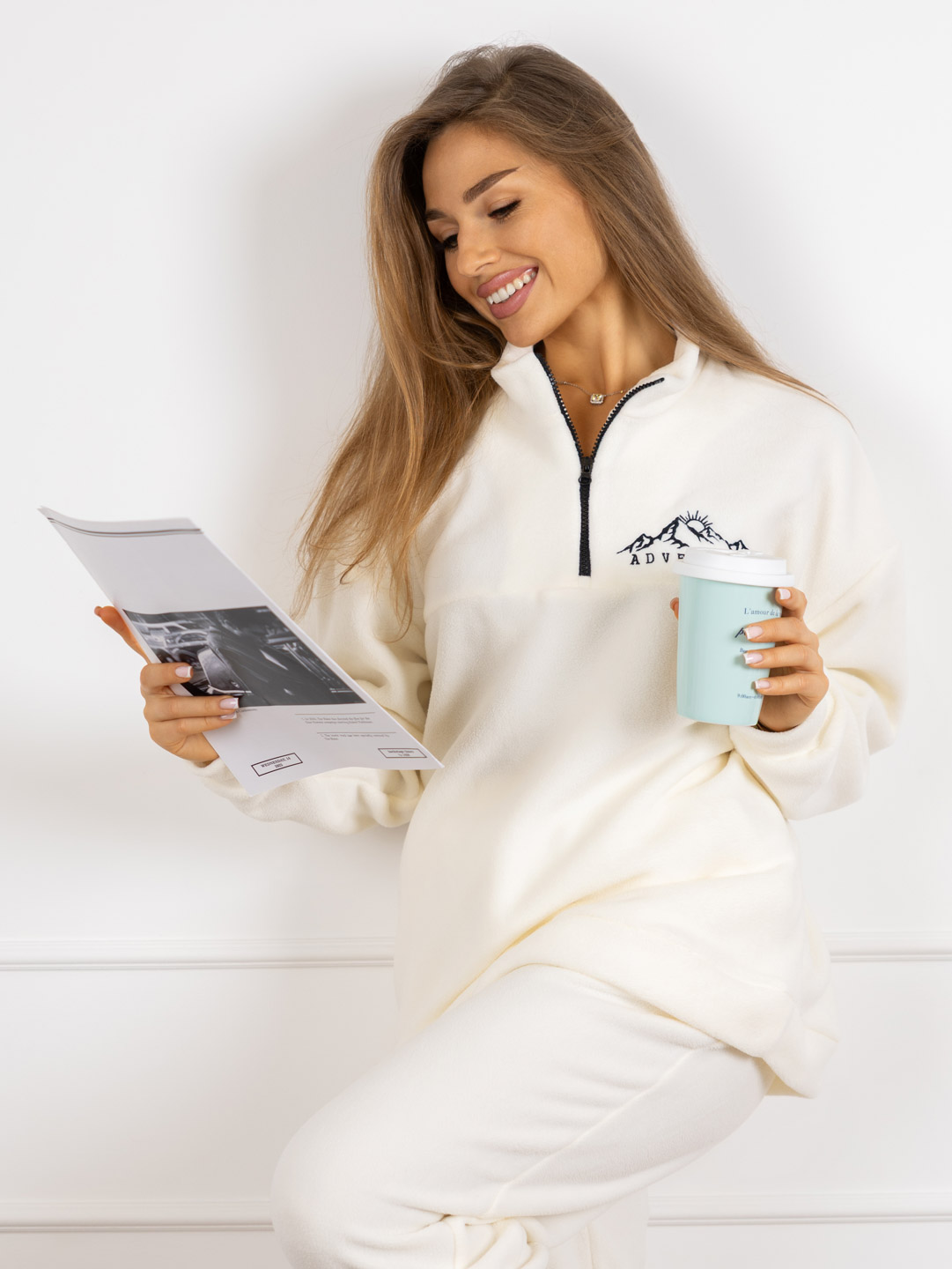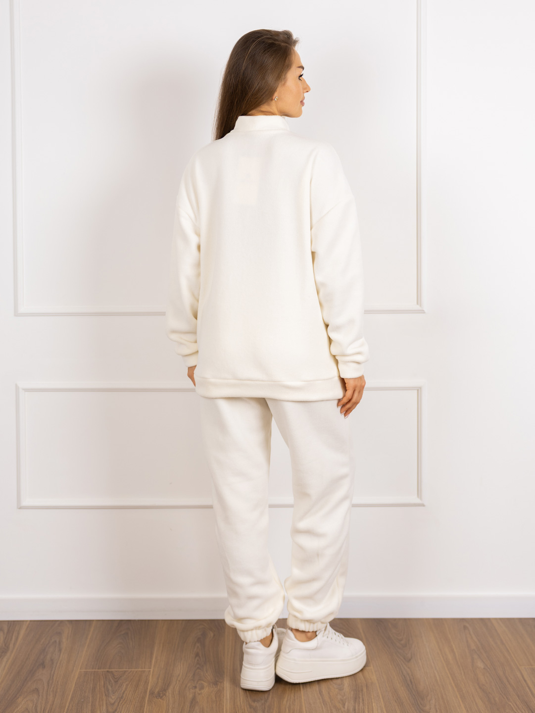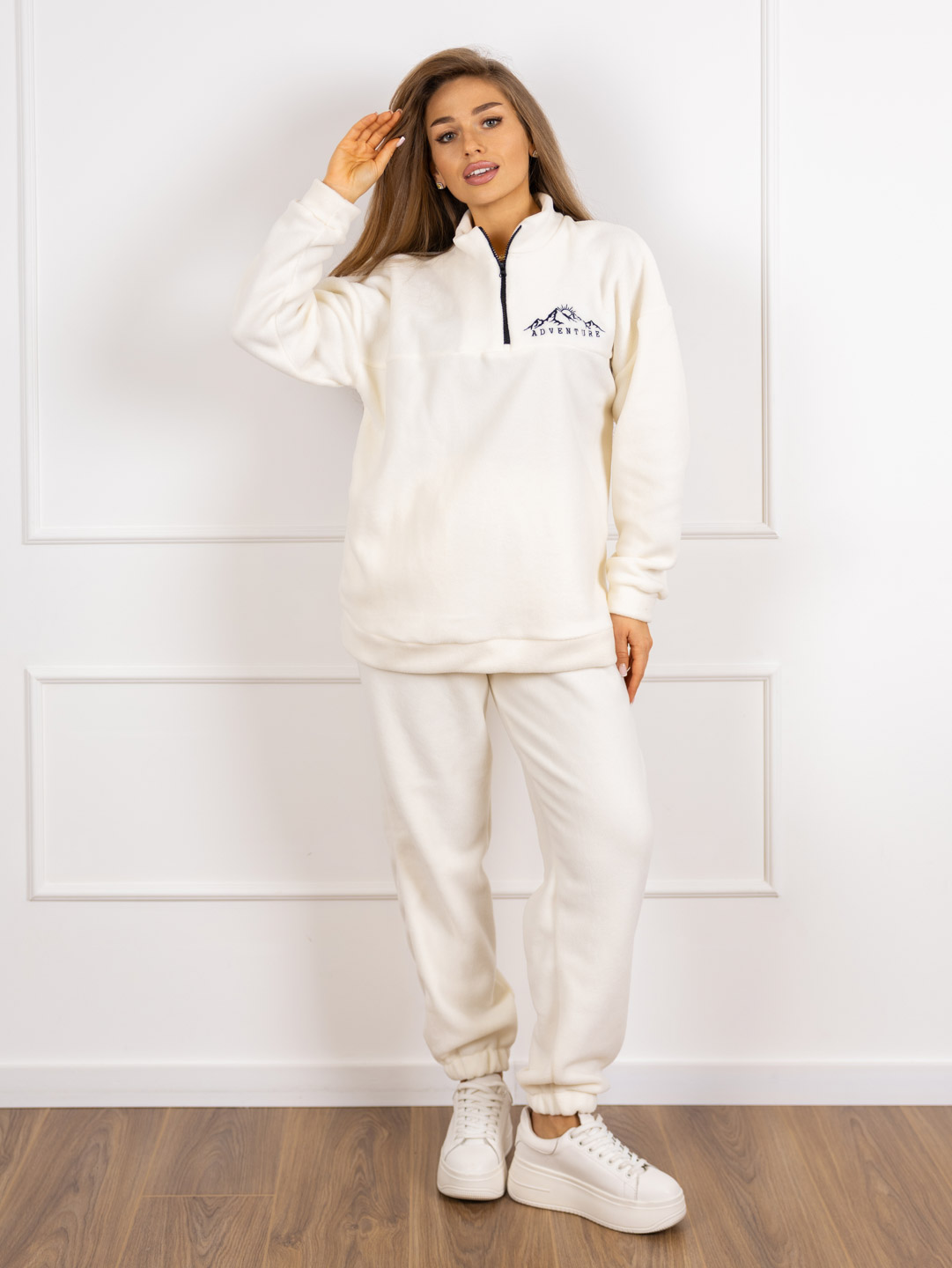 Костюм женский из флиса. Худи "оверсайз", с воротником - стойка на молнии, спущенным рукавом с манжетой и вышивкой на груди. Брюки - джогеры, с удобным поясом с несколькими отстрочками и глубокими карманами. Костюм отлично подойдет для прогулок в прохладную погоду.