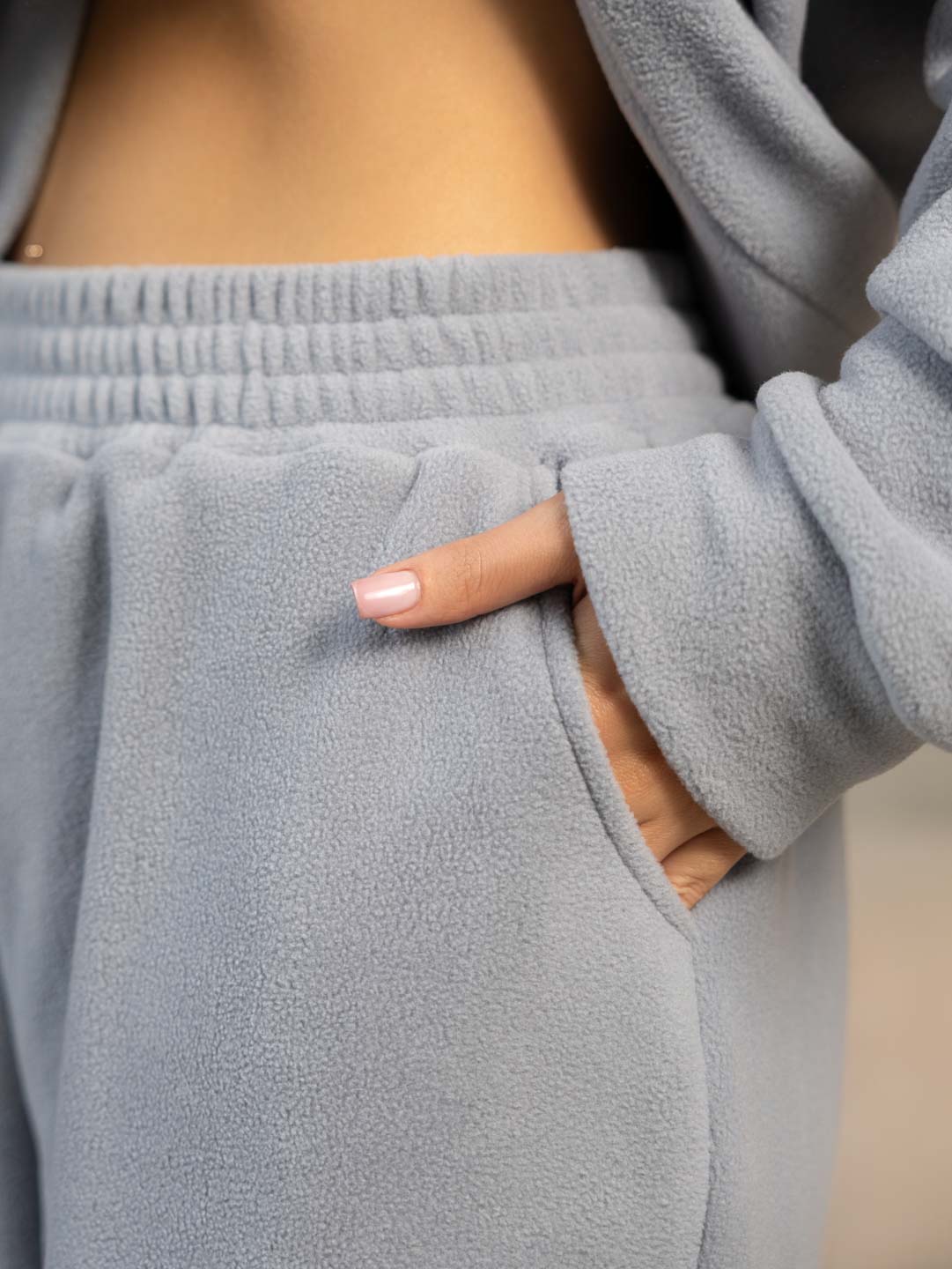 Костюм женский из флиса. Худи "оверсайз", с воротником - стойка на молнии, спущенным рукавом с манжетой и вышивкой на груди. Брюки - джогеры, с удобным поясом с несколькими отстрочками и глубокими карманами. Костюм отлично подойдет для прогулок в прохладную погоду.