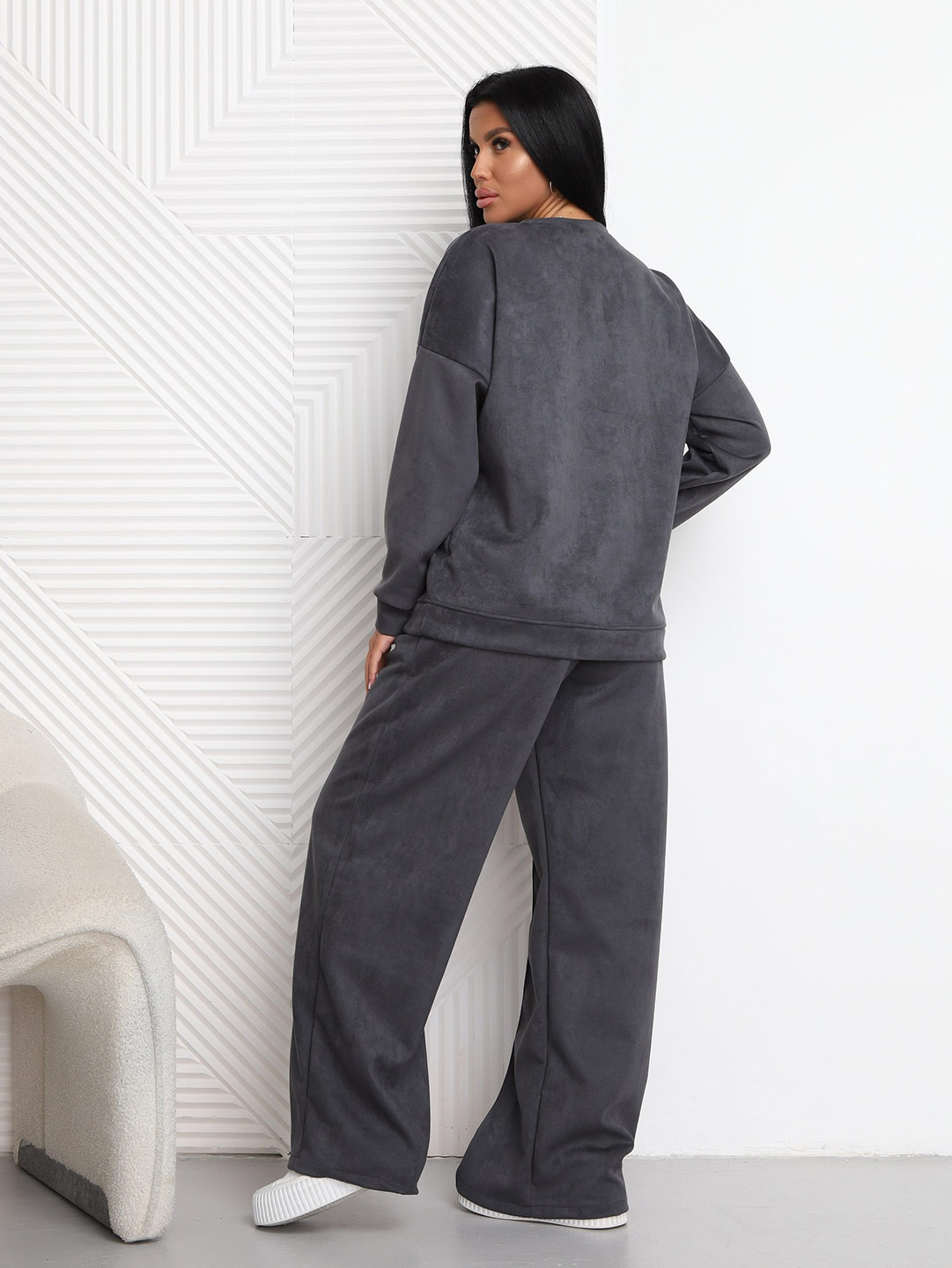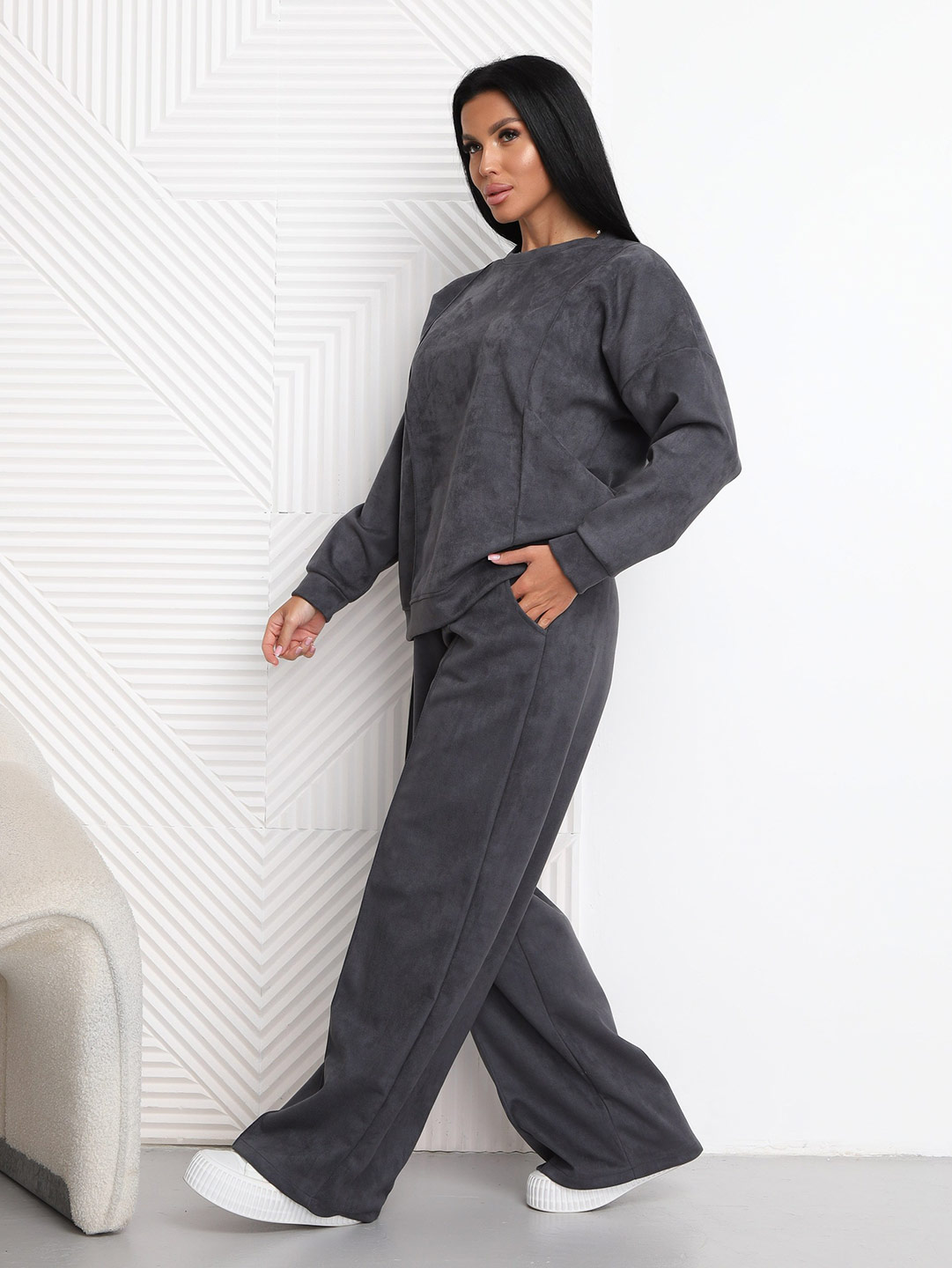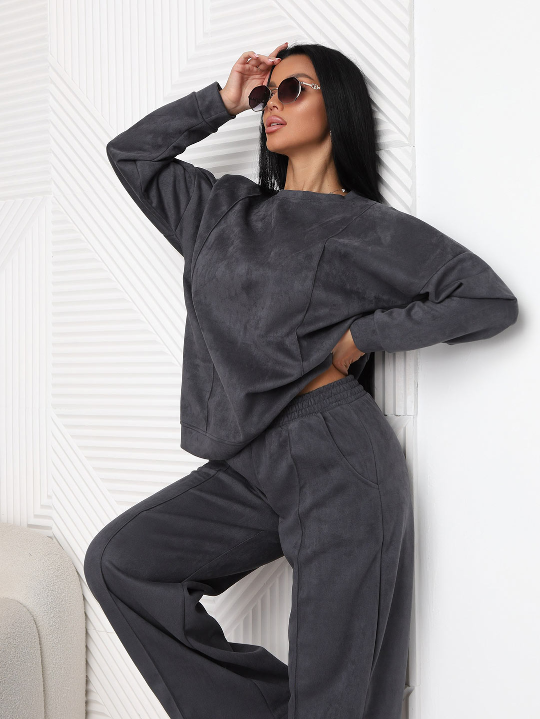 Брючный замшевый костюм из качественного приятного на ощупь полотна. Толстовка выполнена в стиле спорт шик со спущенным плечом, О-образной горловиной, стрелками на полочке и манженой по низу изделия и рукаву. Брюки прямого кроя, со стрелками и карманами в боковых швах, полной длины.