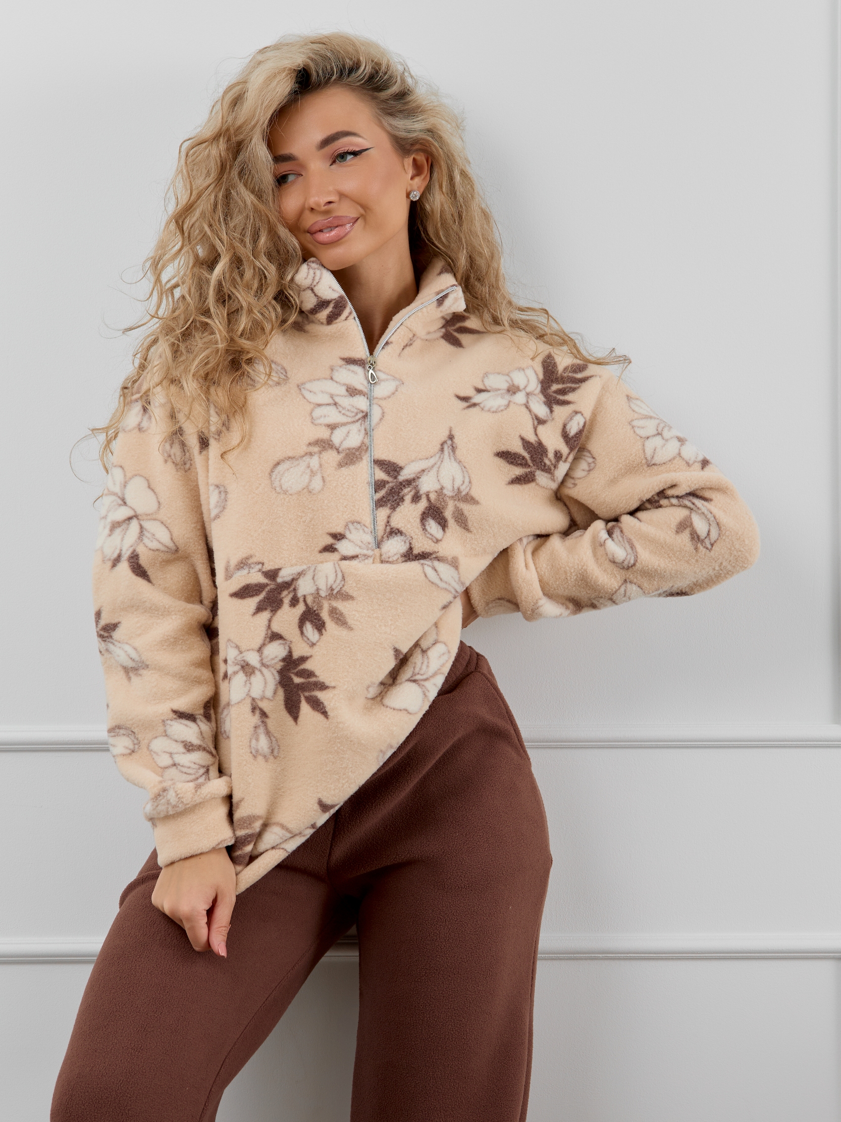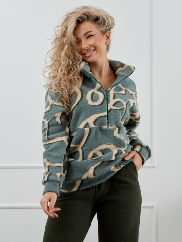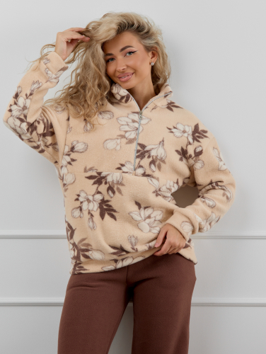 Женский домашний костюм состоит из толстовки с воротником-стойкой на молнии и прямых брюк с карманами. Костюм сидит свободно и не сковывает движения, что делает его идеальным вариантом для активного образа жизни.
