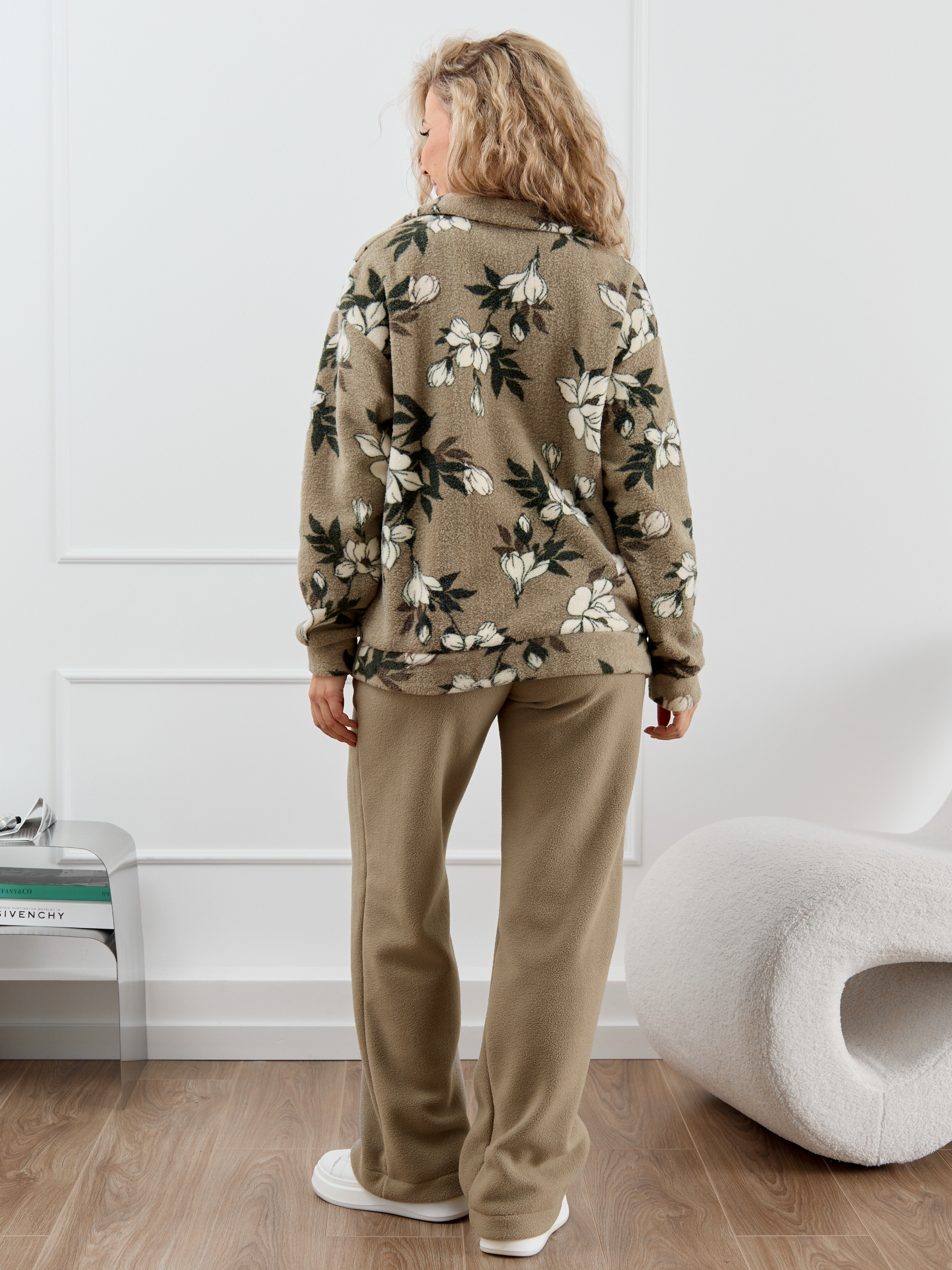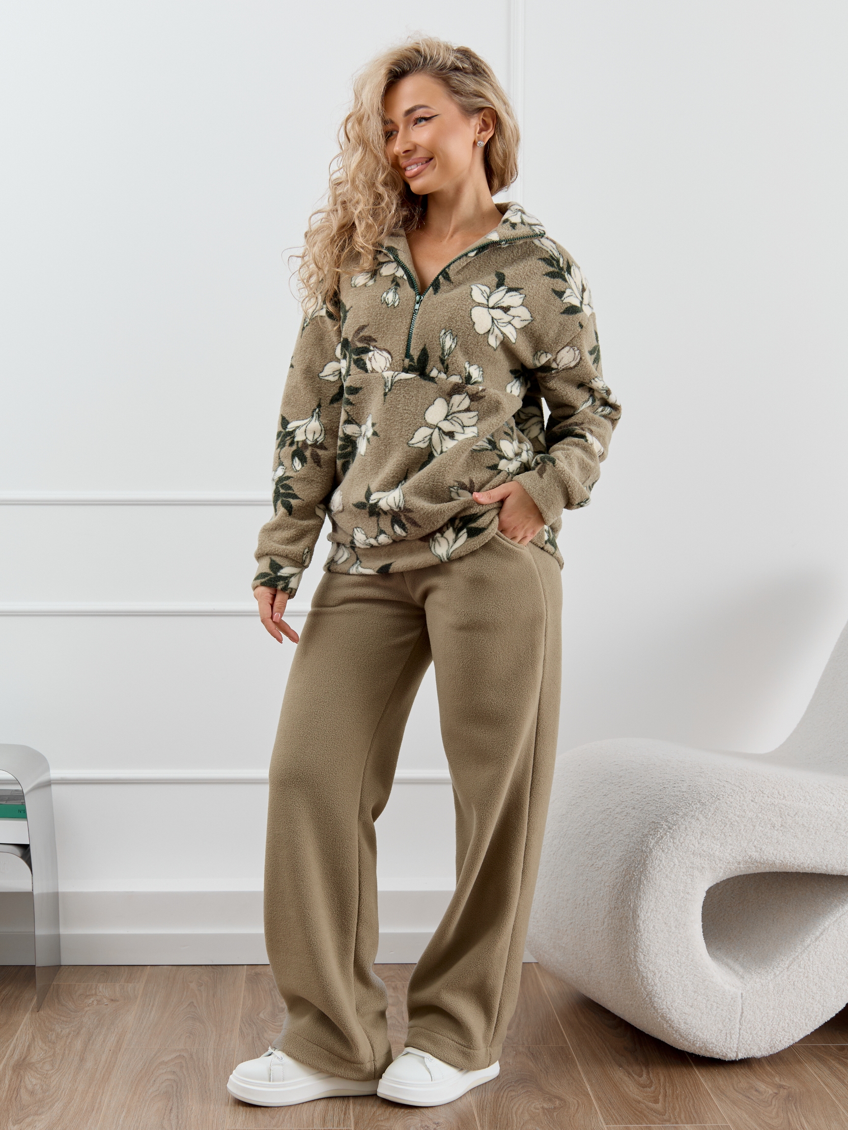 Женский домашний костюм состоит из толстовки с воротником-стойкой на молнии и прямых брюк с карманами. Костюм сидит свободно и не сковывает движения, что делает его идеальным вариантом для активного образа жизни.