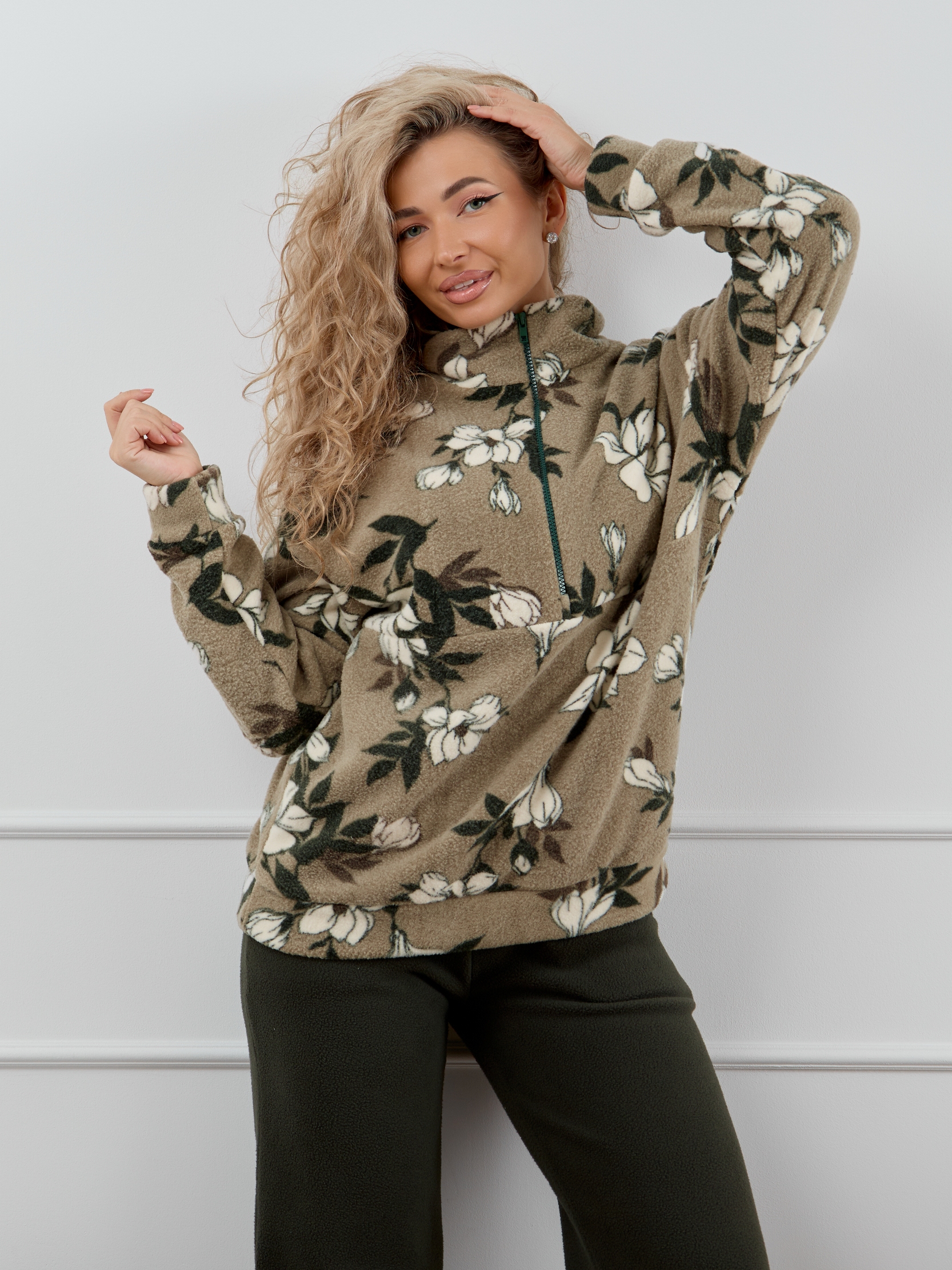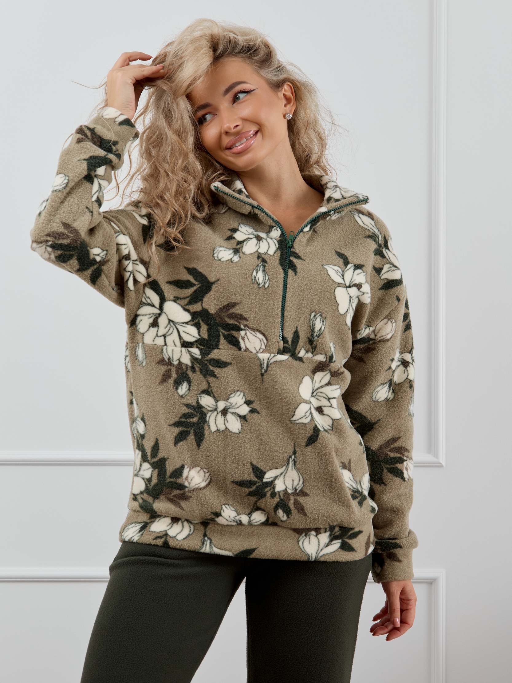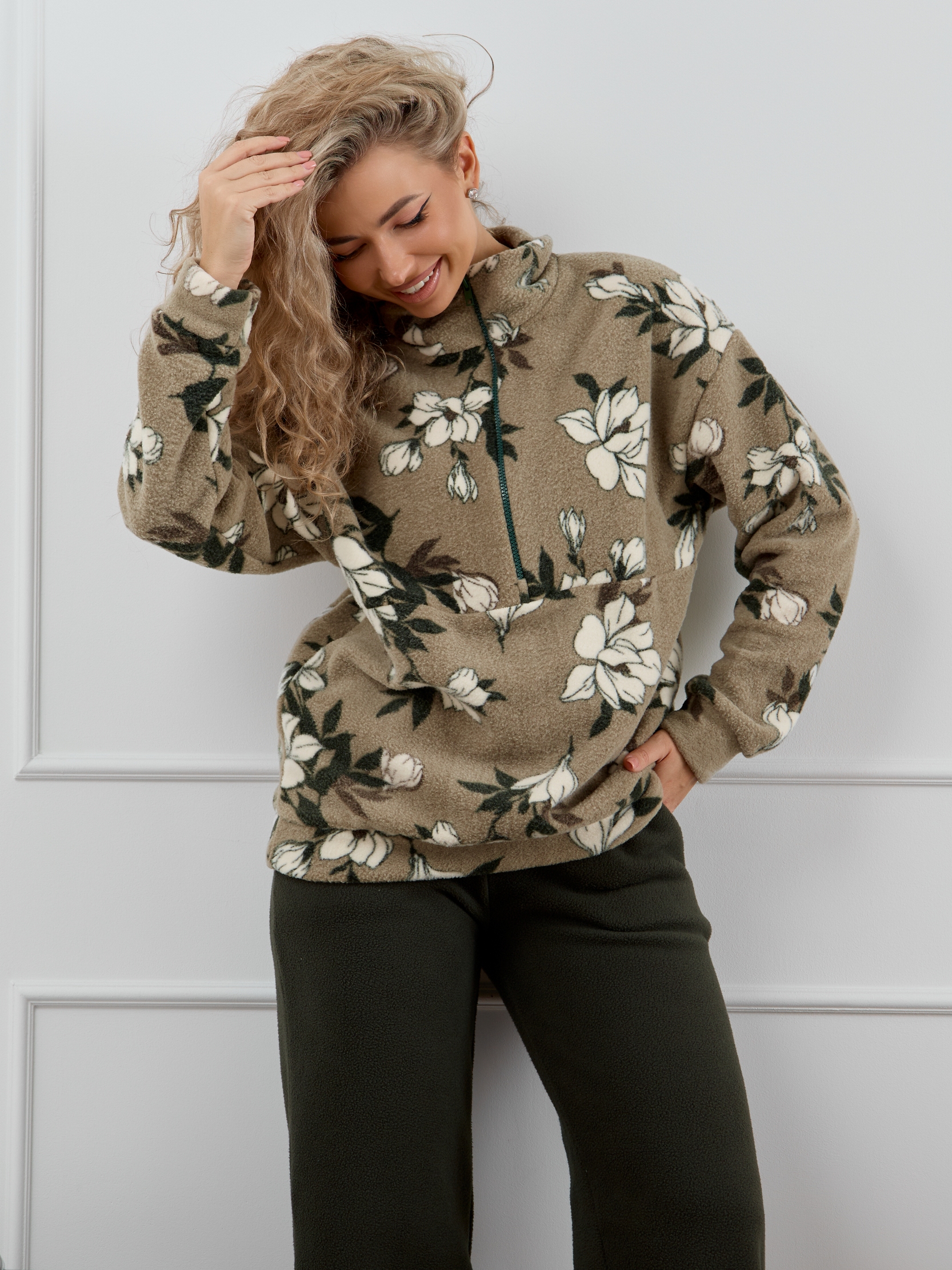 Женский домашний костюм состоит из толстовки с воротником-стойкой на молнии и прямых брюк с карманами. Костюм сидит свободно и не сковывает движения, что делает его идеальным вариантом для активного образа жизни.