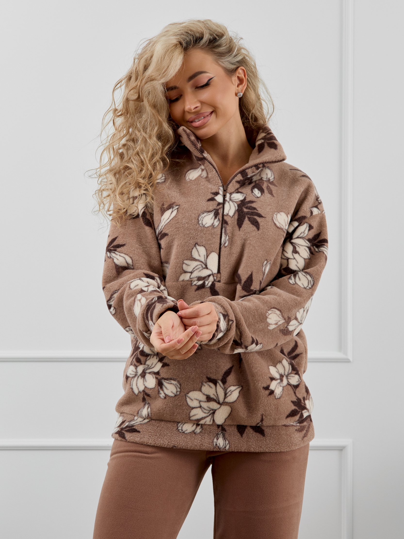 Женский домашний костюм состоит из толстовки с воротником-стойкой на молнии и прямых брюк с карманами. Костюм сидит свободно и не сковывает движения, что делает его идеальным вариантом для активного образа жизни.