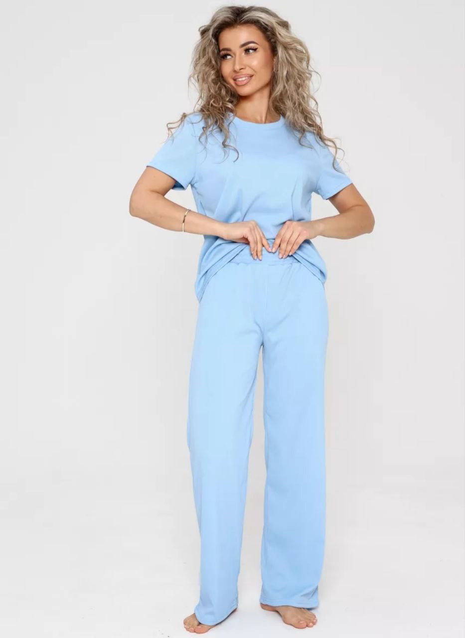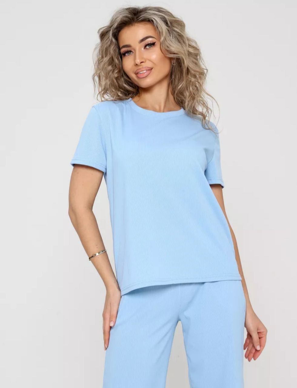 Костюм из ткани «Лапша» состоит из футболки с коротким рукавом и брюк-палаццо с двумя боковыми карманами. Посадка по талии, верхний срез на резинке. Комплект в рубчик выполнен из мягкой и шелковистой вискозы, что делает изделия комфортными для ношения. Вискоза обладает отличной воздухопроницаемостью, что позволяет телу дышать.