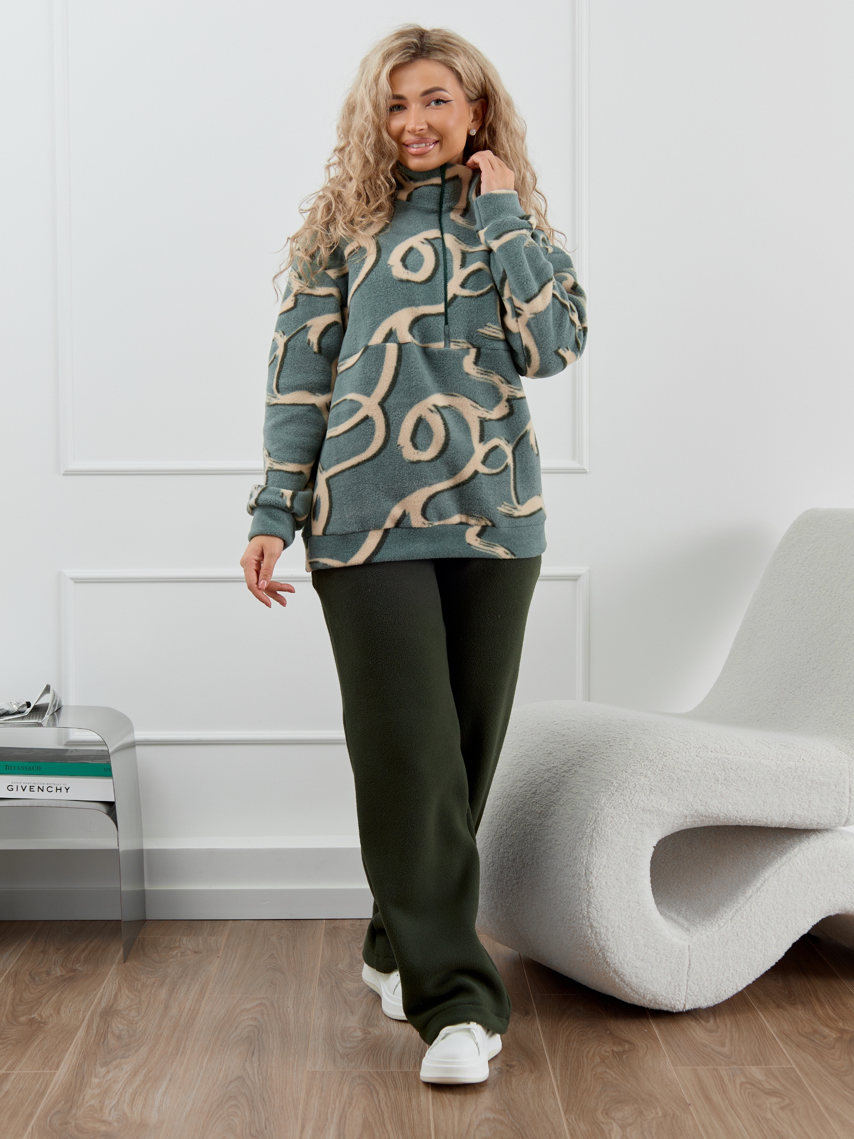 Женский домашний костюм состоит из толстовки с воротником-стойкой на молнии и прямых брюк с карманами. Костюм сидит свободно и не сковывает движения, что делает его идеальным вариантом для активного образа жизни.