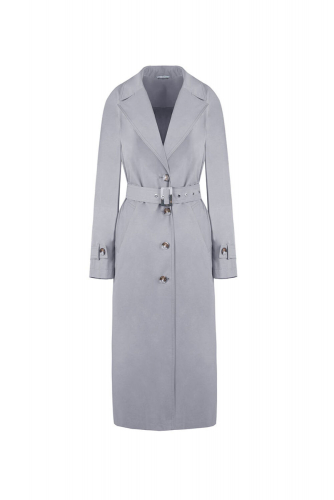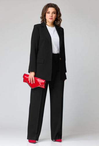 Элегантный костюм-тройка, состоящий из жакета, футболки и брюк. Жакет и брюки выполнены из костюмной ткани, футболка — из трикотажного полотна. Жакет прямого силуэта, с застежкой на две петли и две пуговицы. Перед жакета с нагрудной вытачкой, с прорезными карманами в рамку с клапаном. Спинка жакета со средним швом, заканчивающийся шлицей, левая часть спинки с прорезным карманом в рамку, вход в который фиксирует навесная петля с пуговицей. Рукава двухшовные втачные. Горловина оформлена воротником пиджачного типа. Белая футболка прямого силуэта  со спущенной линией плеча и втачным рукавом. Горловина обработана трикотажной бейкой из основной ткани. Брюки классической формы, прямого силуэта, со стрелками по передним и задним половинкам. Верхний срез обработан обтачным поясом. На задних половинках расположены талиевые вытачки, с декоративными листочками. В боковых швах брюк - наклонные карманы. Застёжка центральная на тесьму молнию и крючок.