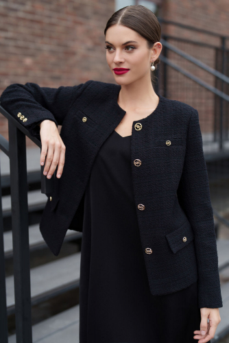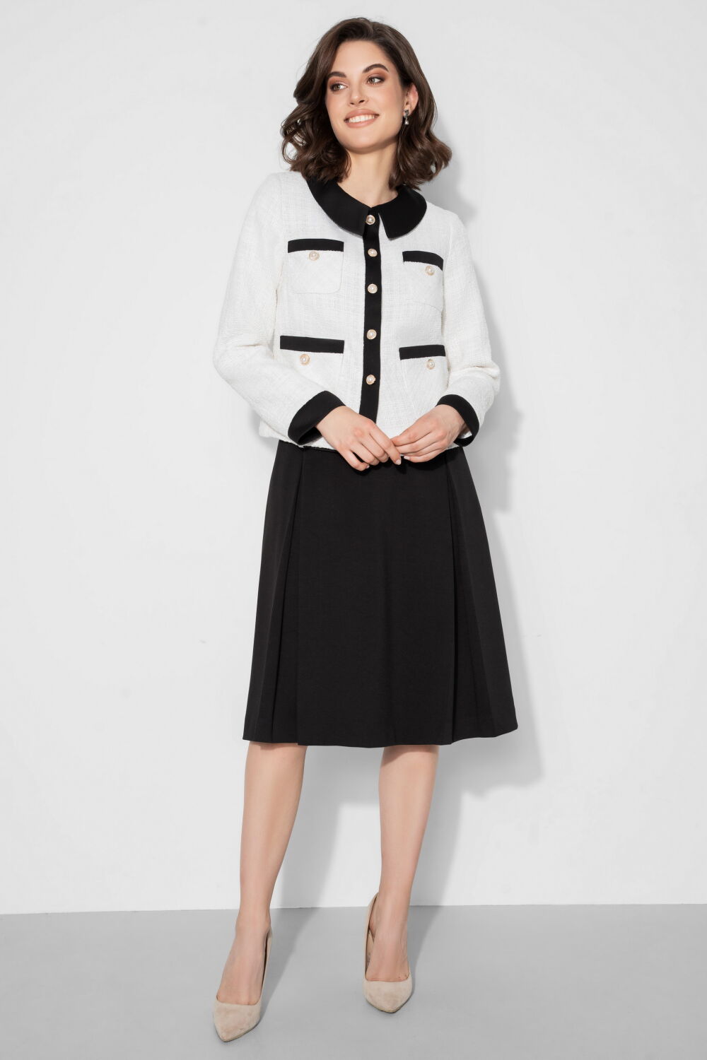Этот стильный женский костюм с юбкой  — идеальное сочетание элегантности и комфорта. Жакет из белого твида с контрастной отделкой придаёт образу изысканность, а чёрная юбка добавляет строгости и шарма. Костюм идеально подойдёт для деловых встреч, офисных будней и формальных мероприятий.