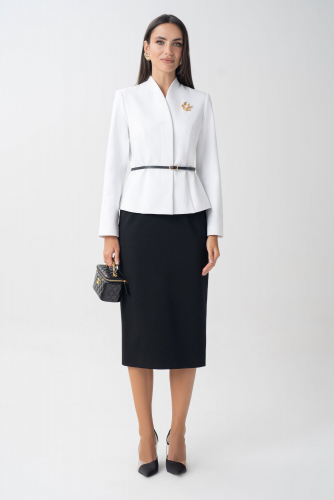 Воротник, лацканы, борта, низ переда и спинки обработан отделочным серебристым кантом. Жакет с плечевыми накладками.